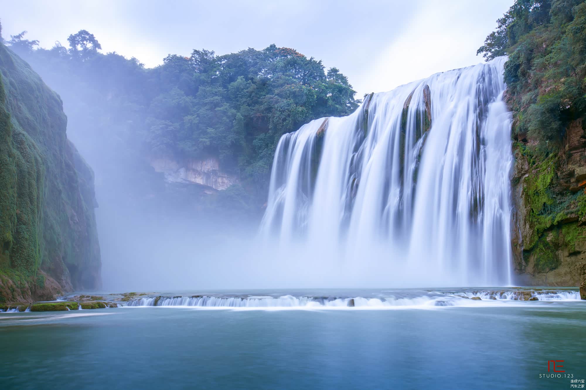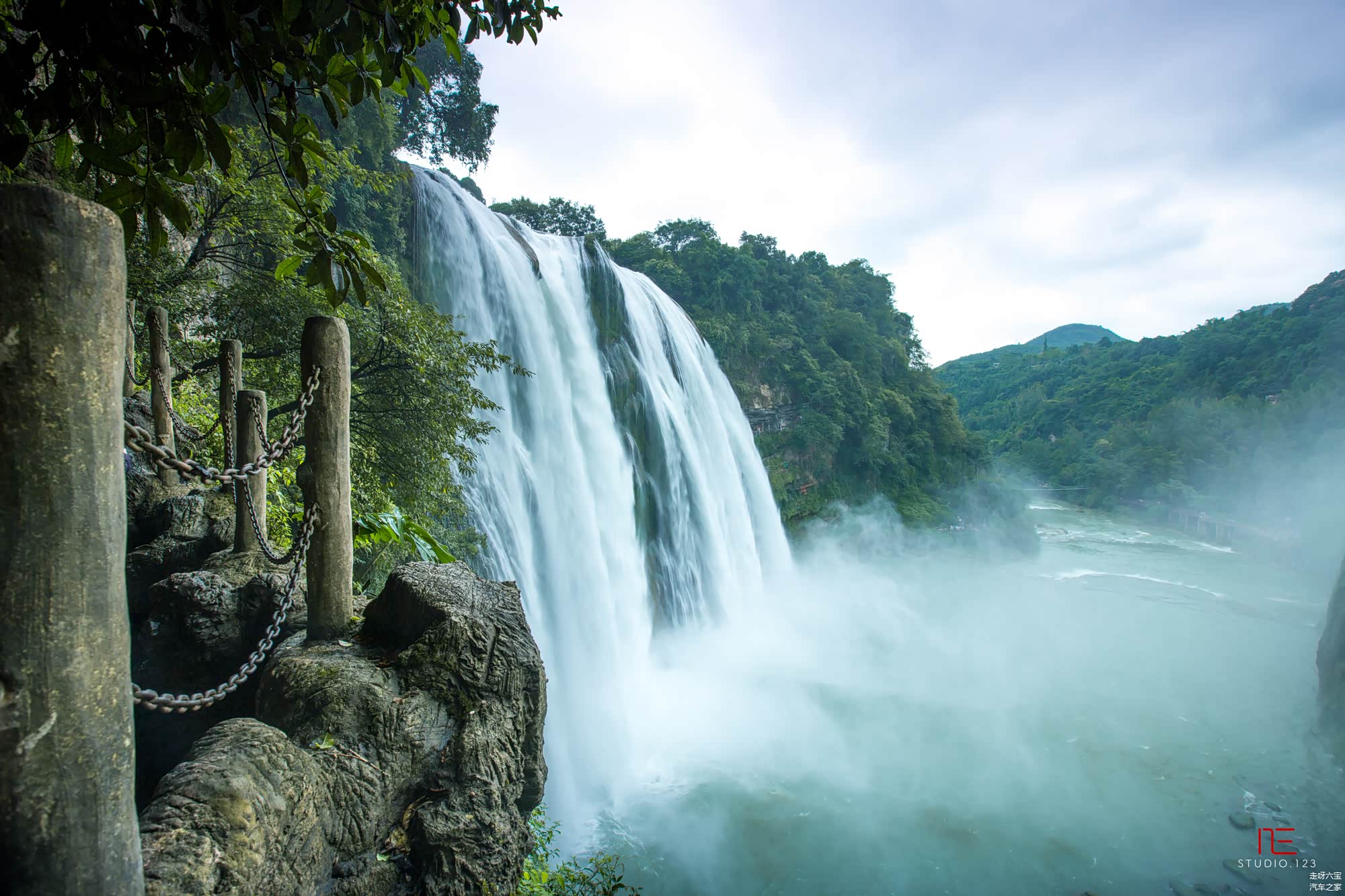 黄果树瀑布 ,高77.8米,以水势浩大著称,属喀斯特地貌中的侵蚀裂典型瀑布。瀑布气势磅礴,声如巨雷轰鸣,势如万马奔腾。雄伟壮观。