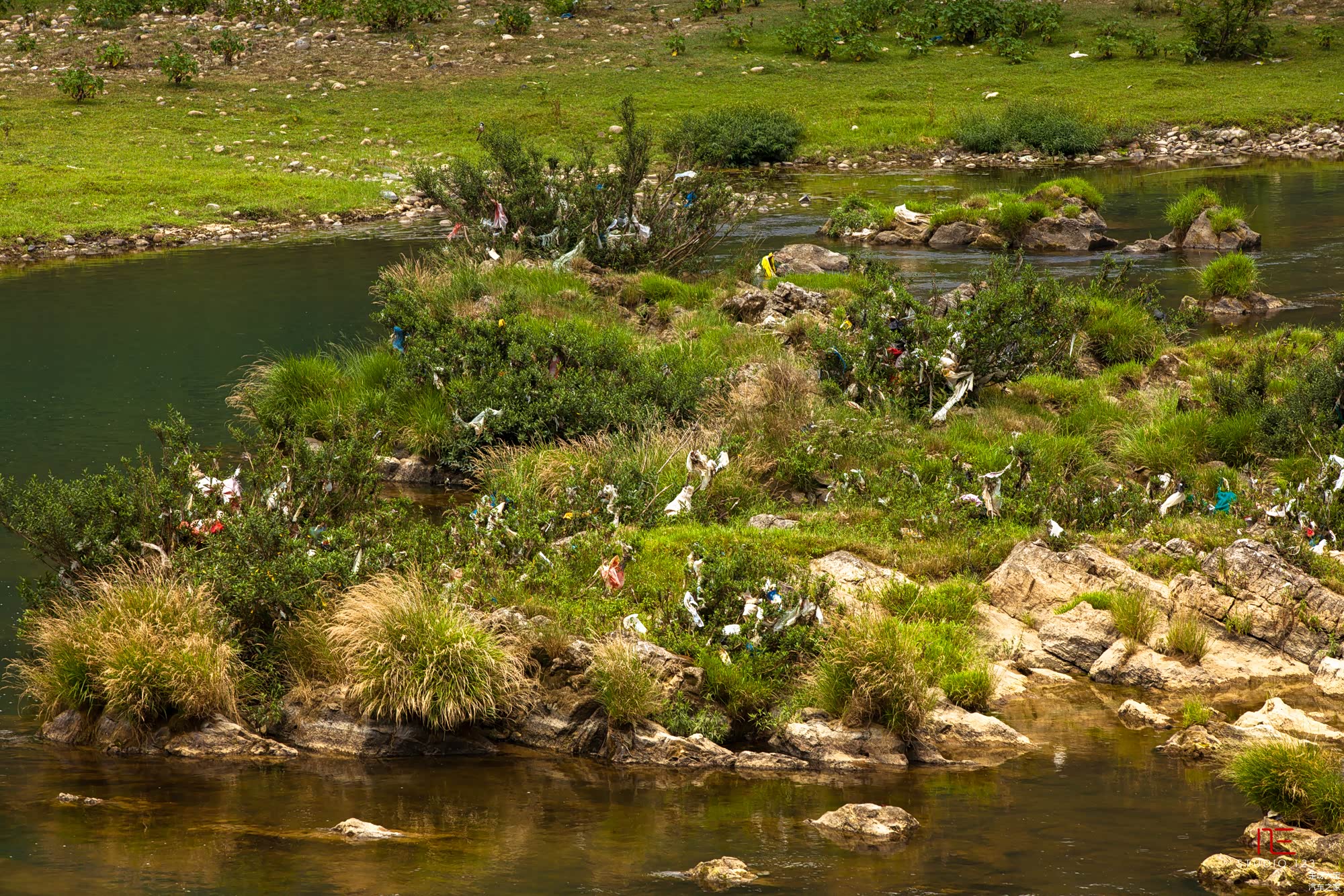 以为河道草丛里是花草,拉近看却看到了遍地的垃圾。