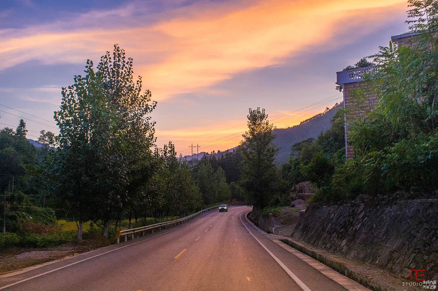 康定机场附近的一条公路,傍晚天空,不远处还下着雨,此行路上印象最深刻的风景。