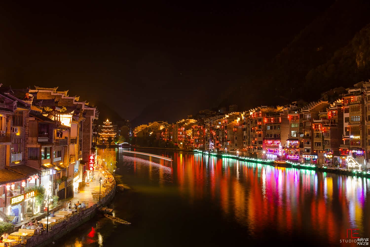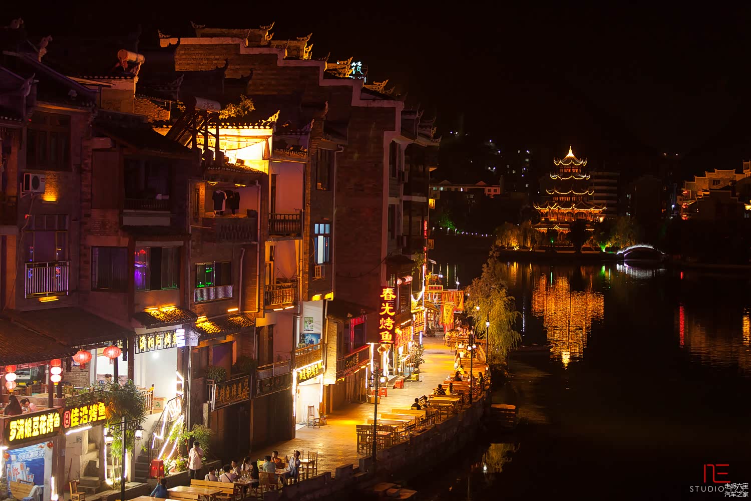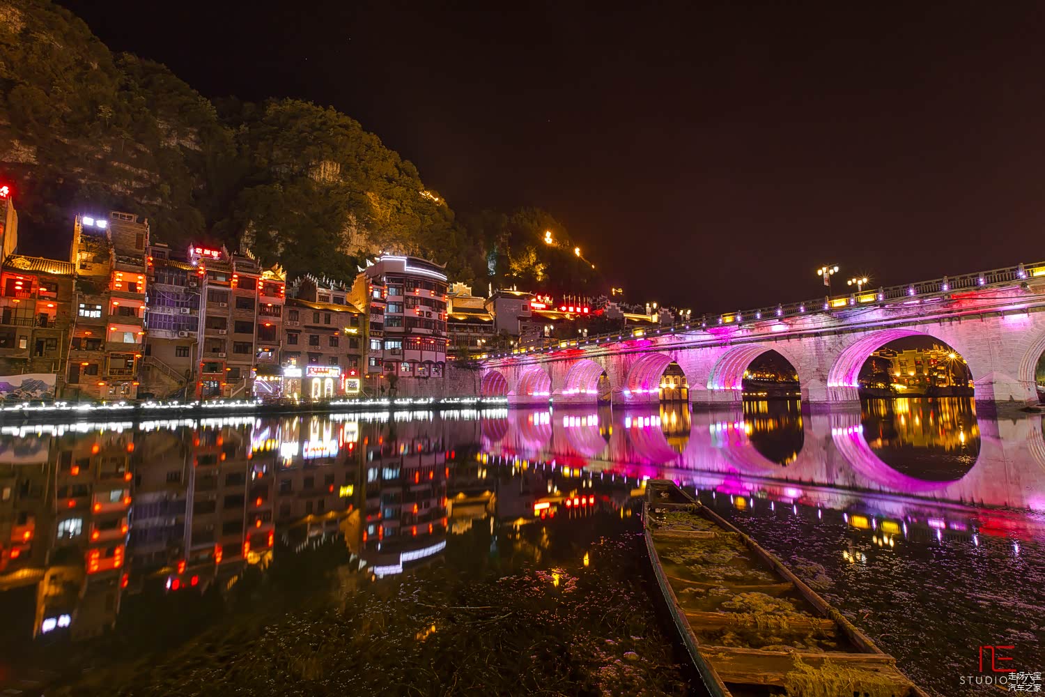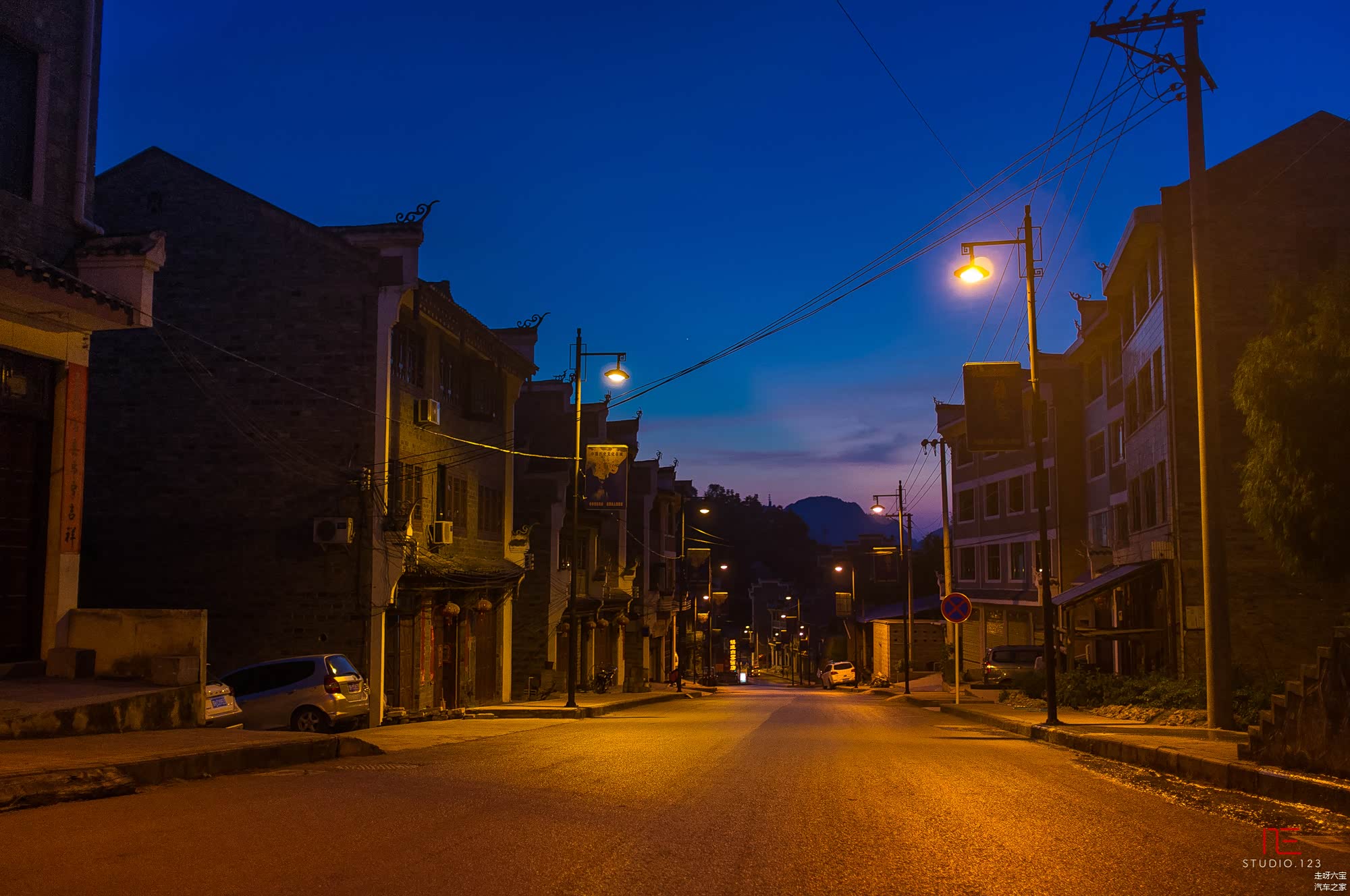 两天都一直在赶路,当车开进 镇远 古城时,天正好变成了青黛色,夕阳已经落下,天空还留着对它最后的那一抹粉紫色的眷恋,让我们着实惊艳了一把。建筑在路灯下静静地立着,向远来的我们默默的表达着她们的欢迎之意。