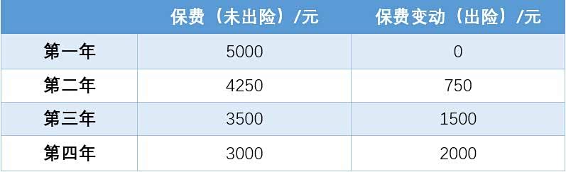 一旦发生事故走了保险,第二年你的保费就会恢复到1,也就是原价,如果一年内出了两次事故,那么来年保费会变为1.25,也就是提高了25%,同理三次会变为1.5,四次1.75,五次就成了2,也就是第二年要付原价的两倍,即1万元人民币。