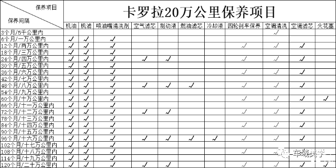 可能大部分客户车开不到十年或不到二十万公里即换更高级别的车,但是今天小编还是为大家带来了卡罗拉十年or二十万公里内的所有保养项目,如下图所示。