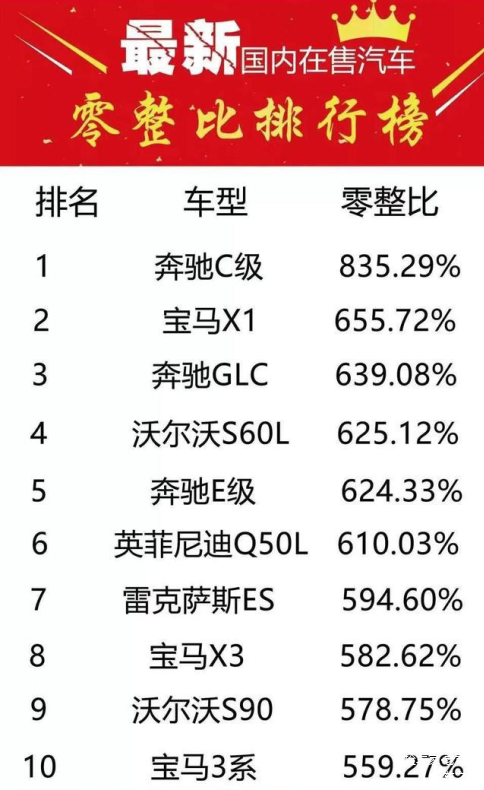 在每年的报告中, 奔驰C级(图片 | 参数 | 询价)、E级、GLC和宝马X1这几款车的曝光度都很高,它们成绩很稳定,一直是排行榜的前几名。2019年的排行榜也不例外,奔驰C级的零整比一骑绝尘,高达835.29%,简直是霸榜级的存在啊!835.29%这个数据意味着什么呢?它意味着将一台奔驰C级车全部零件拆散卖掉的钱可以买八辆新的奔驰C级。奔驰车维修保养贵不贵,从这里可以直观的看出来。怎么样,各位是不是发现了一个发家致富的良机呢?