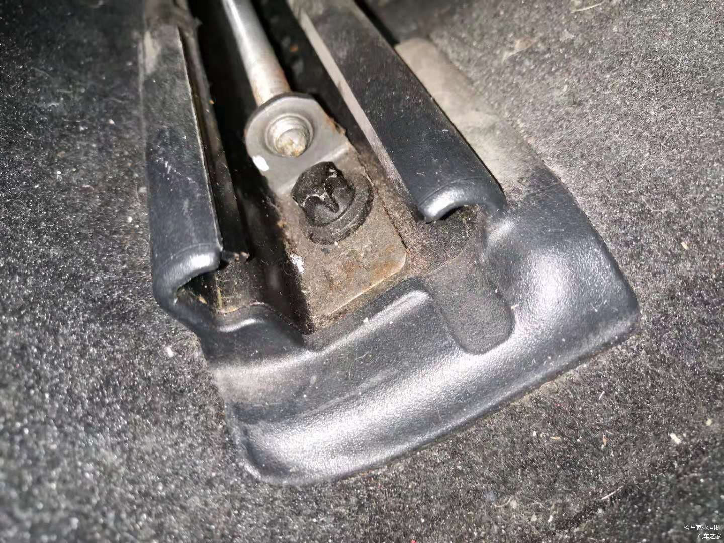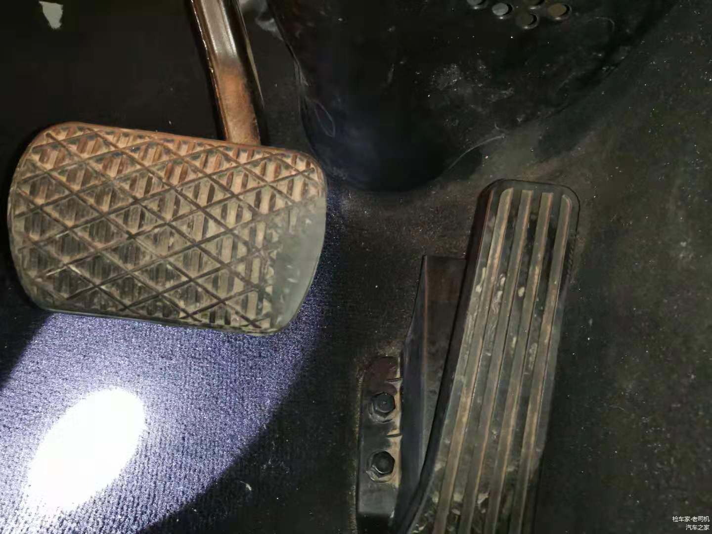 可以看到,刹车踏板右侧边角处已经有较深的磨损了,这里告诉大家一个小技巧,一般来说车子很少更换刹车踏板,而从刹车踏板的磨损程度就可以大概的推断此车的真实公里数。单从这个刹车踏板看的话,二鹏我判断此车已经跑了7万多公里,与仪表显示的里程数相差不大。