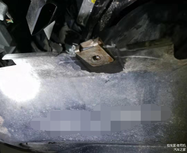 前防撞梁与纵梁之间的固定螺丝有很明显的拆卸痕迹,不过暂时还不能判断前防撞梁有没有更换;纵梁梁头处有很多油污,但是梁头上部的发动机部位并没有漏油的痕迹,油污是哪里来的呢?