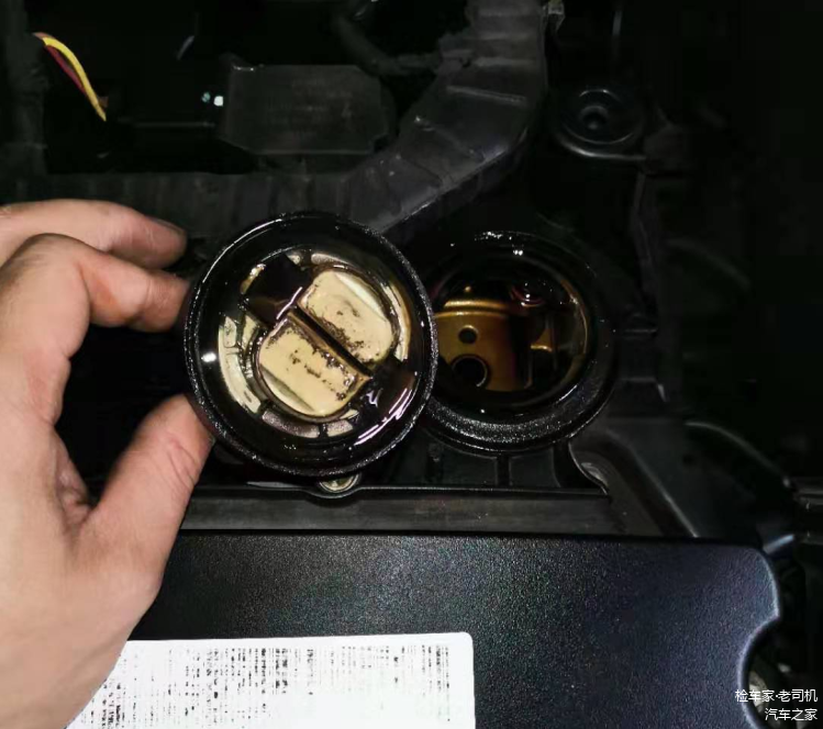 打开机油盖发现有一些异常,机油盖上面机油已经成白色了,一般来说机油与水融合之后就会出现这种乳化现象,但是通过加油口简单的观察发动机内部并没发现严重的乳化现象,但是这种情况还是建议去做一个检修,以防机油变质对发动机造成损伤。