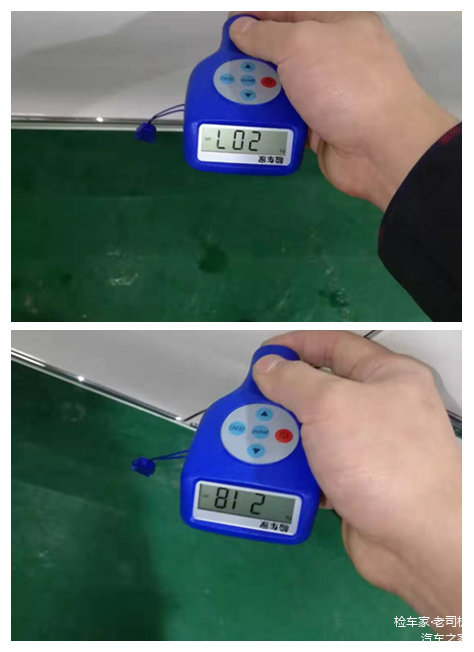 拿出辅助仪器测量车身金属漆面,原车漆面正常数值在130-150微米,左前叶子板的漆面数值显示200微米,说明喷漆了,而且表面的橘皮较为严重。