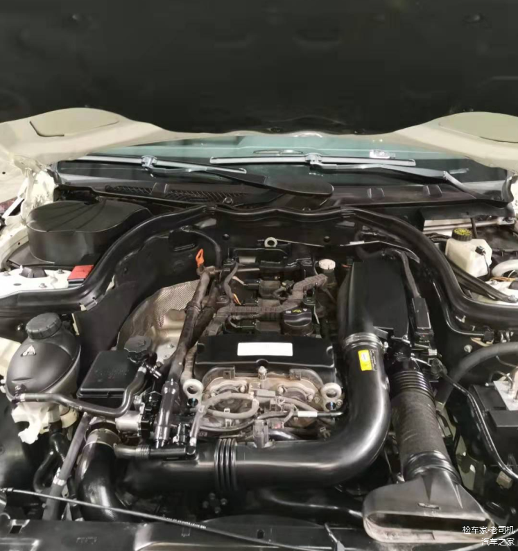 打开发动机舱盖,看到机舱内部管路分布有点儿杂乱,不过还算干净整洁,表面被喷上了一层表板蜡,这都是车商收车后清洗整备的。这款C200搭载了一台1.8T的涡轮增压发动机,最大功率135kW(184马力),最大扭矩270牛米,零百公里加速时间7.8秒;匹配7挡手自一体变速箱,这套动力对于刚拿驾照的客户小姐姐来说是不是太浪费了。