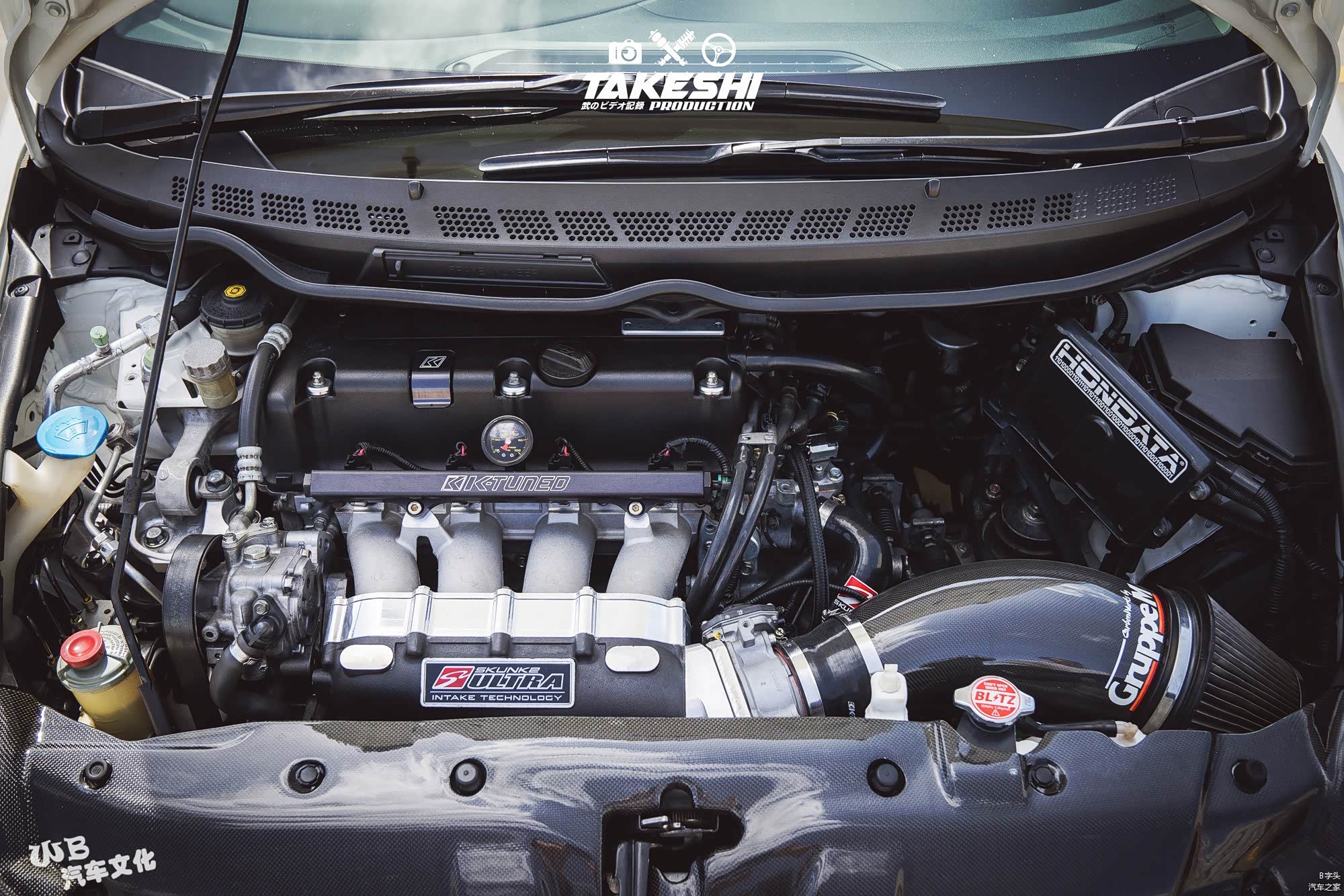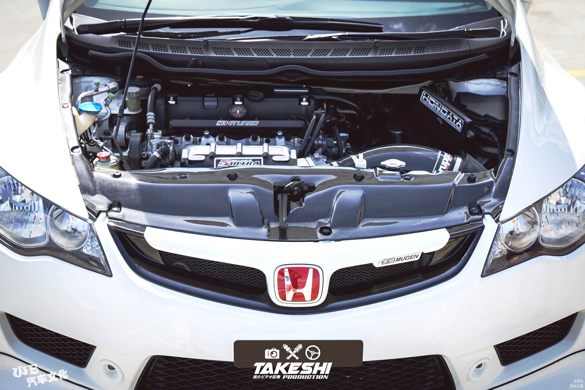 打开引擎盖,看似平凡却不简单。RAY可是花费心思在这颗K24引擎以NA自然进气来达到VTEC的极限爆发力,几乎整颗引擎每一个部件都改装了,变速箱也一并进行了相当的升级。电板选用HONDATA ENGINE MANAGEMENT来调教,最后得到的数据为马力285WHP与扭力270。(动力改装列表会列在下面供大家参考)