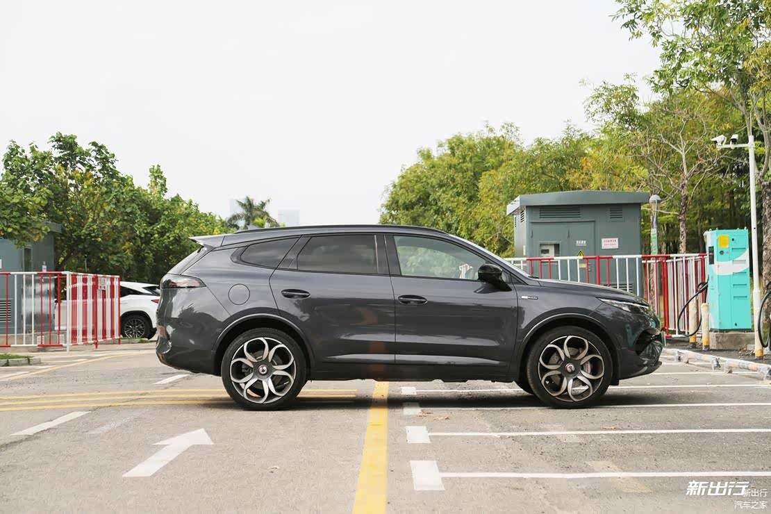 侧面可以看到整个车的线条与唐相似,但是 22 寸的大轮毂以及前六活塞的 Brembo 刹车则非常的引人注目。后窗玻璃采用了隐私设计,保障后排乘客的隐私。
