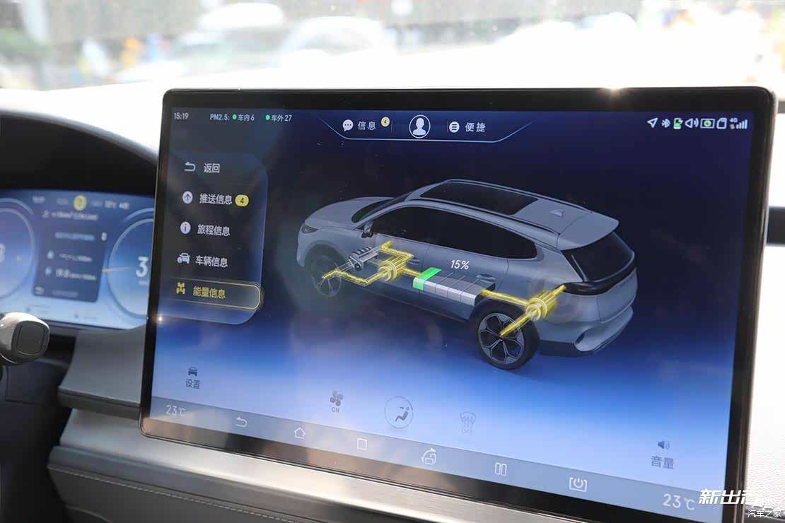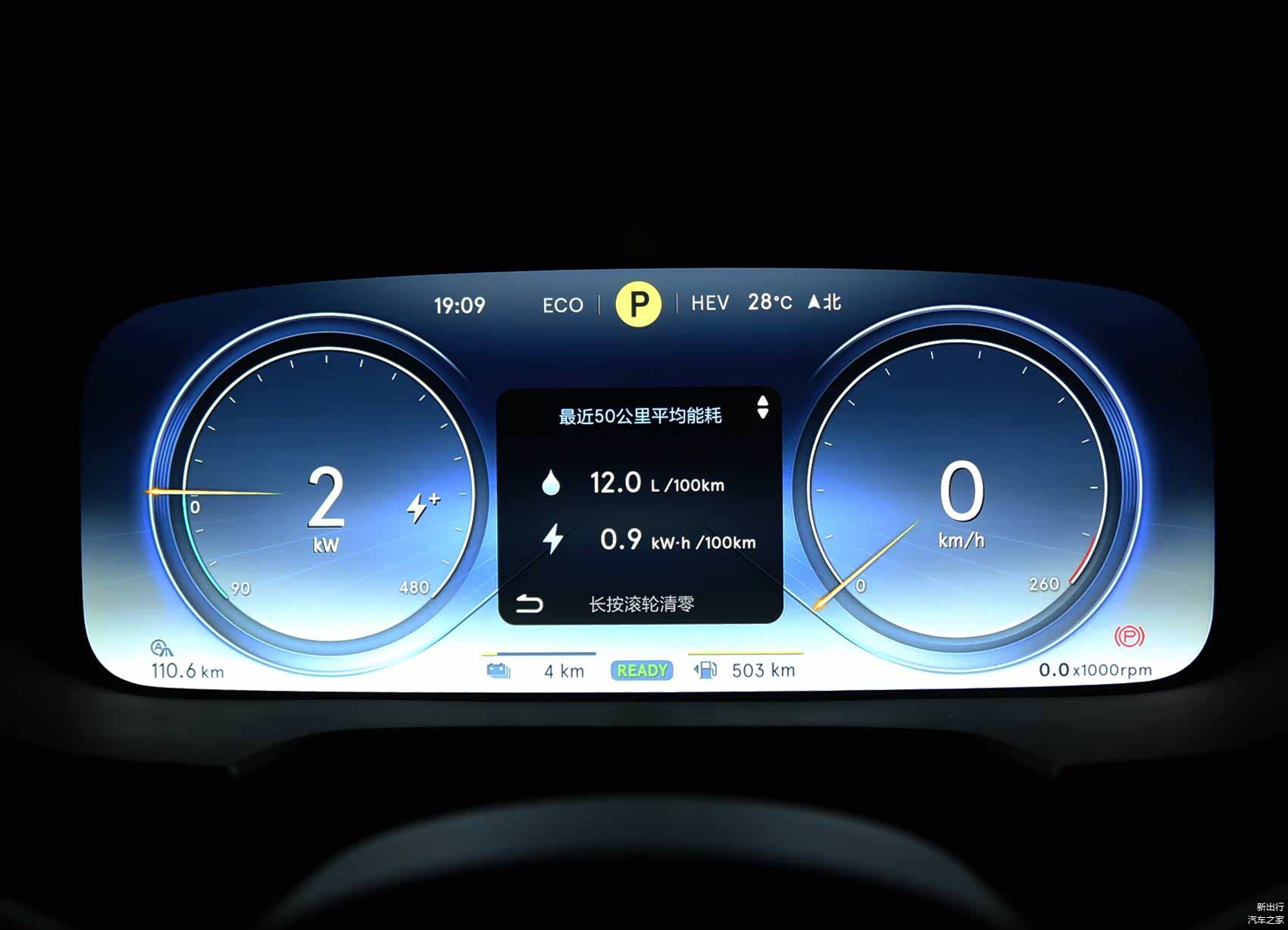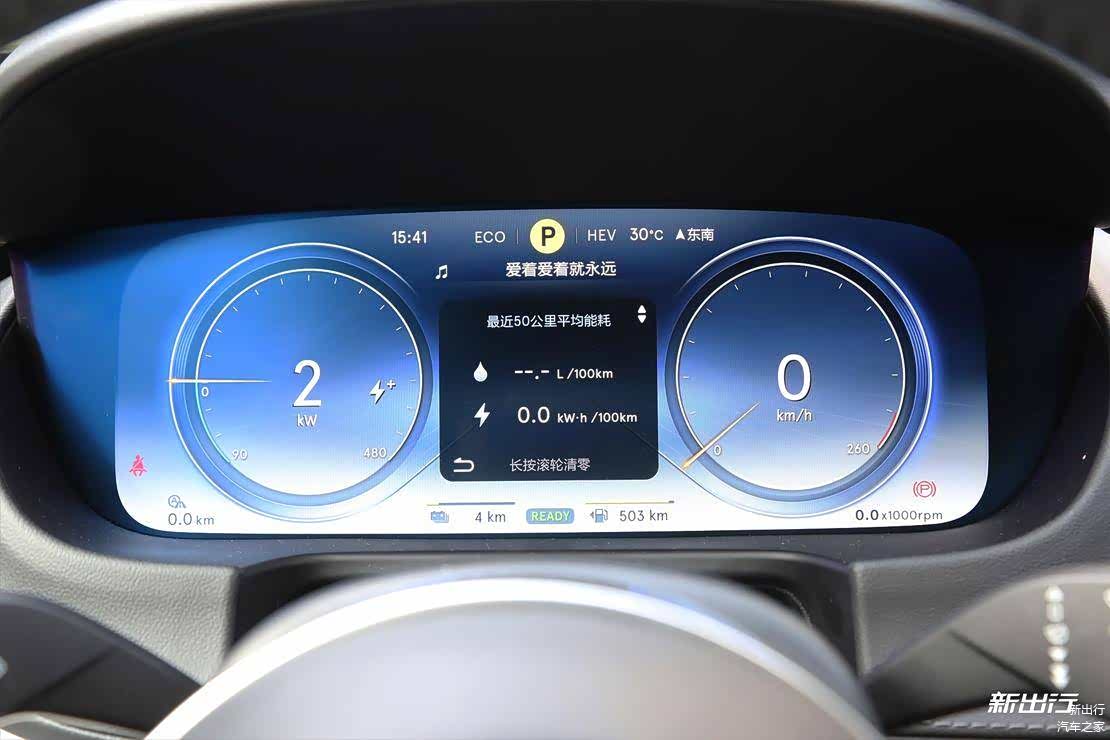 在纯电续航测试结束后,我们将车辆加满油到看到油液表面后,随即开始亏电油耗测试。测试时车辆的设置与纯电续航测试时相同,测试开始时车辆剩余电量很低 —— 表显纯电剩余续航仅为 4km 。