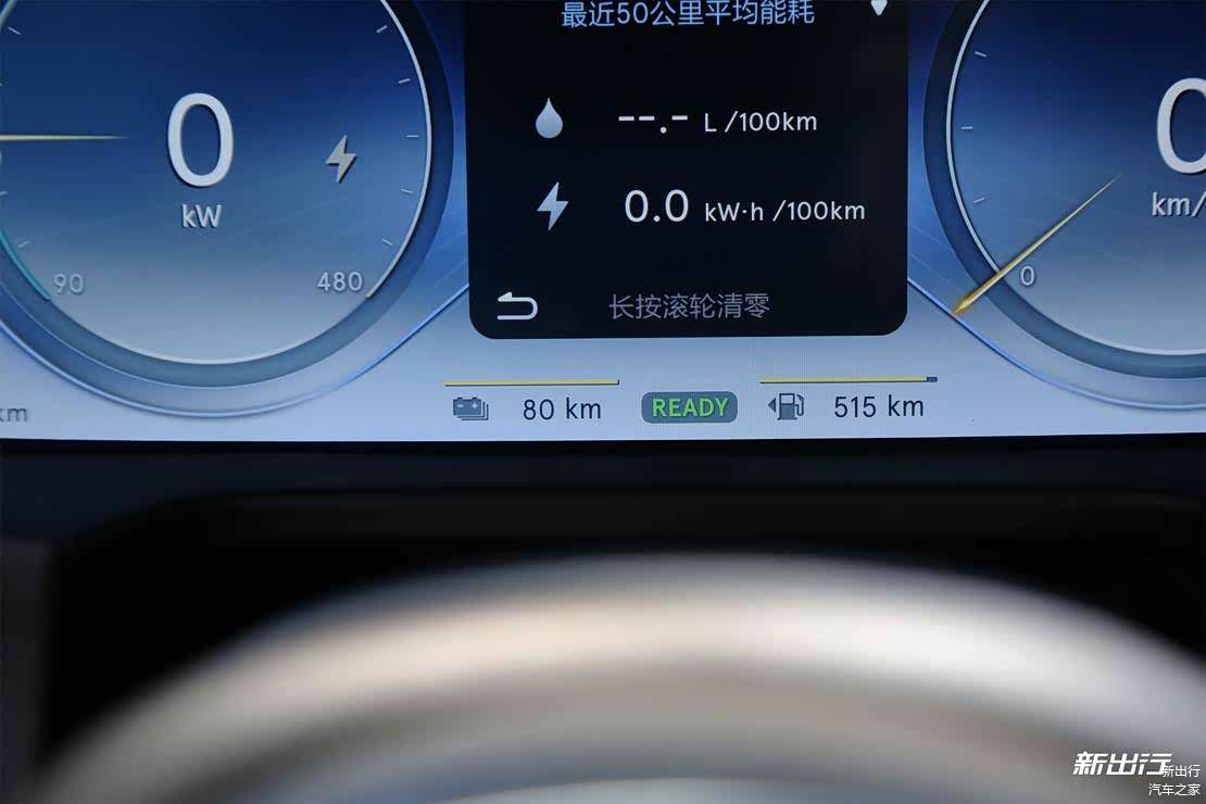 出发时电量显示剩余 100%、满电纯电续航里程剩余 81km。在经过车上进行一番设置后,在出发前纯电续航剩余 80km。而后纯电 EV 模式下行驶了 78.4km 时,表显纯电剩余还剩 6km ,电池电量剩余 15%,为 SOC 最低电量。