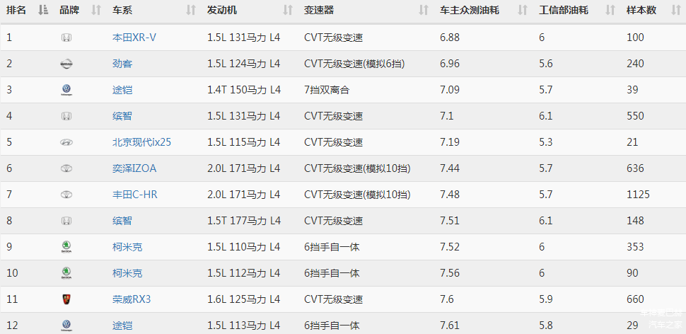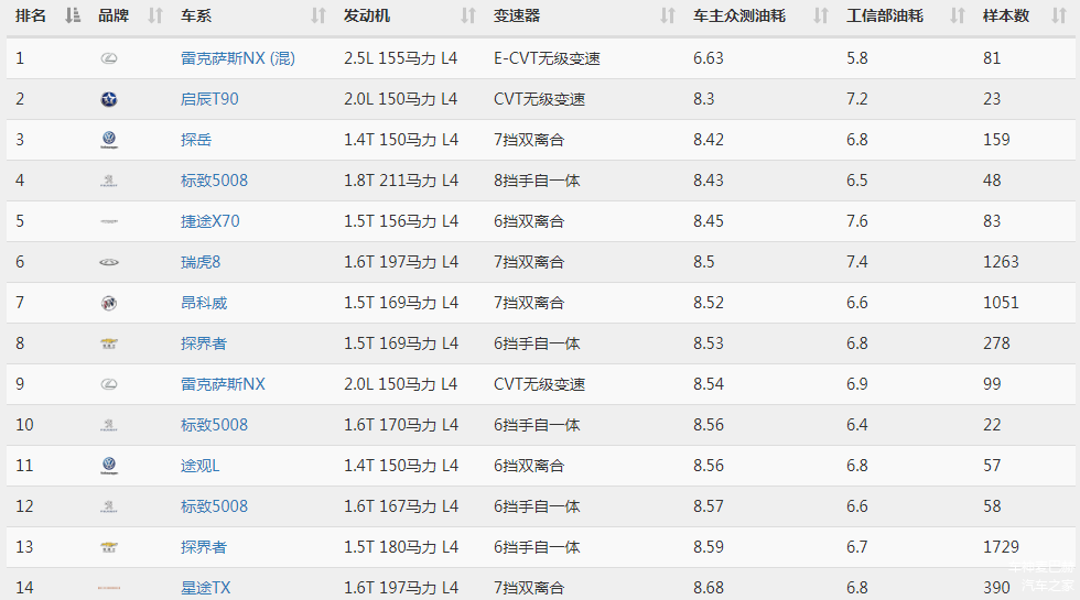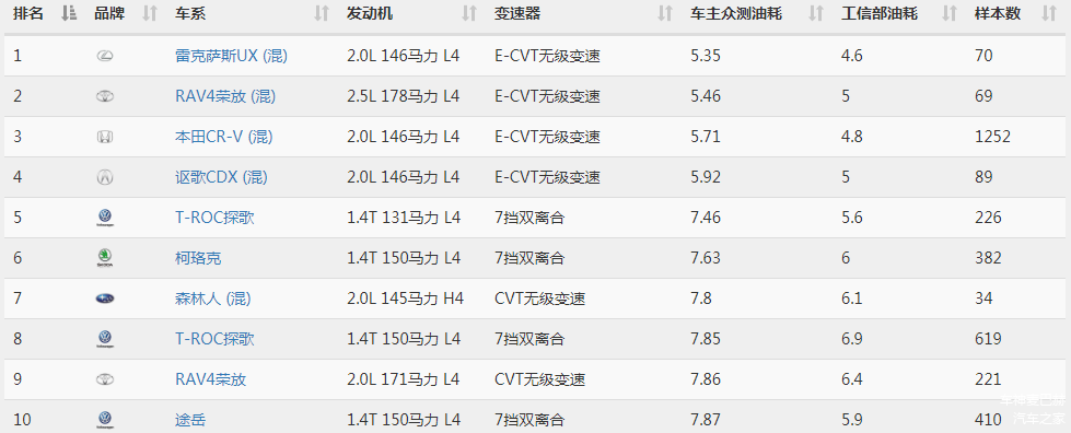 由于丰田系的混动一致霸榜,我们直接筛选了涡轮增压+自动挡车型的油耗,这次就没有丰田什么事了,毕竟日系车大部分都是自吸动力,雪佛兰科沃兹为1.0T+6AT组合。