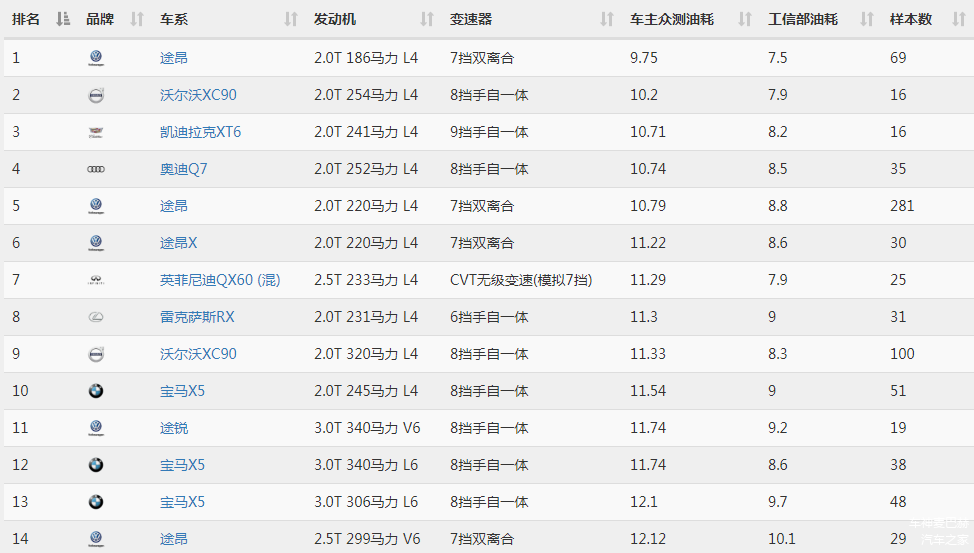 如果4S店销售告诉你大型SUV油耗不到10个,基本断定是骗人的,这里只有一款车是10L一下的,就是大众途昂(还是2.0T低功率),其次沃尔沃XC90表现也非常不错,这里2.0T发动机的豪华SUV居多,3.0T版本的都在11升以上。