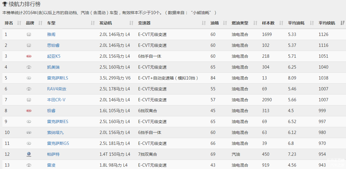 雅阁之前挑战一箱油跑一千公里的活动,混动版本平均确实可以,这里能跑1000公里的车型都是混动版,只有帕萨塔为1.4T续航里程为954KM,虽然碰撞成绩一般,但是续航还是可以的。