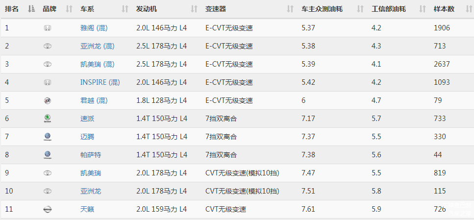 混动车型确实是省油的,雅阁、亚洲龙、凯美瑞、INSPIRE、君越都是混动车型,斯柯达速派、迈腾、帕萨塔大众系都是1.4T+7DCT的组合,凯美瑞、亚洲龙、天籁的自吸表现也还不错。