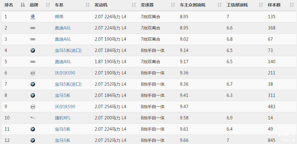 这里我们直接筛选了涡轮增压车型,就没有日系车的身影了,大众系的辉昂、奥迪A6L表现不错,宝马5系的丐中丐平均油耗也接近9升,沃尔沃S90低功率在9升左右,所有车型的高功率都在10L左右,毕竟豪车地板油是经常的事。