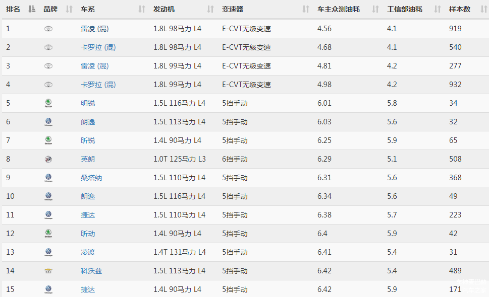 其次是大众系的斯柯达明锐、朗逸、昕锐车型,不过都是1.5L+5速手动挡组合,油耗基本在6L左右,别克英朗的1.0T发动机+6速手动组合紧随其后,剩下的就是桑塔纳、捷达等车型,大众系的手动挡确实比较省油。