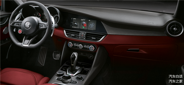 内饰方面,Giulia的设计就不如外观那般令人惊艳了,整体造型布局比较简洁,不过,中控台的曲线和圆形按钮、出风口设计还是体现出了意式风情。整个内饰最吸睛的还属方向盘,造型别致的三幅式方向盘内集成了一键启动按钮,与法拉利相似的设计逻辑很能“挑逗”驾驶者的感官刺激,方向盘换挡和加热也是全系标配,运动氛围异常浓厚。