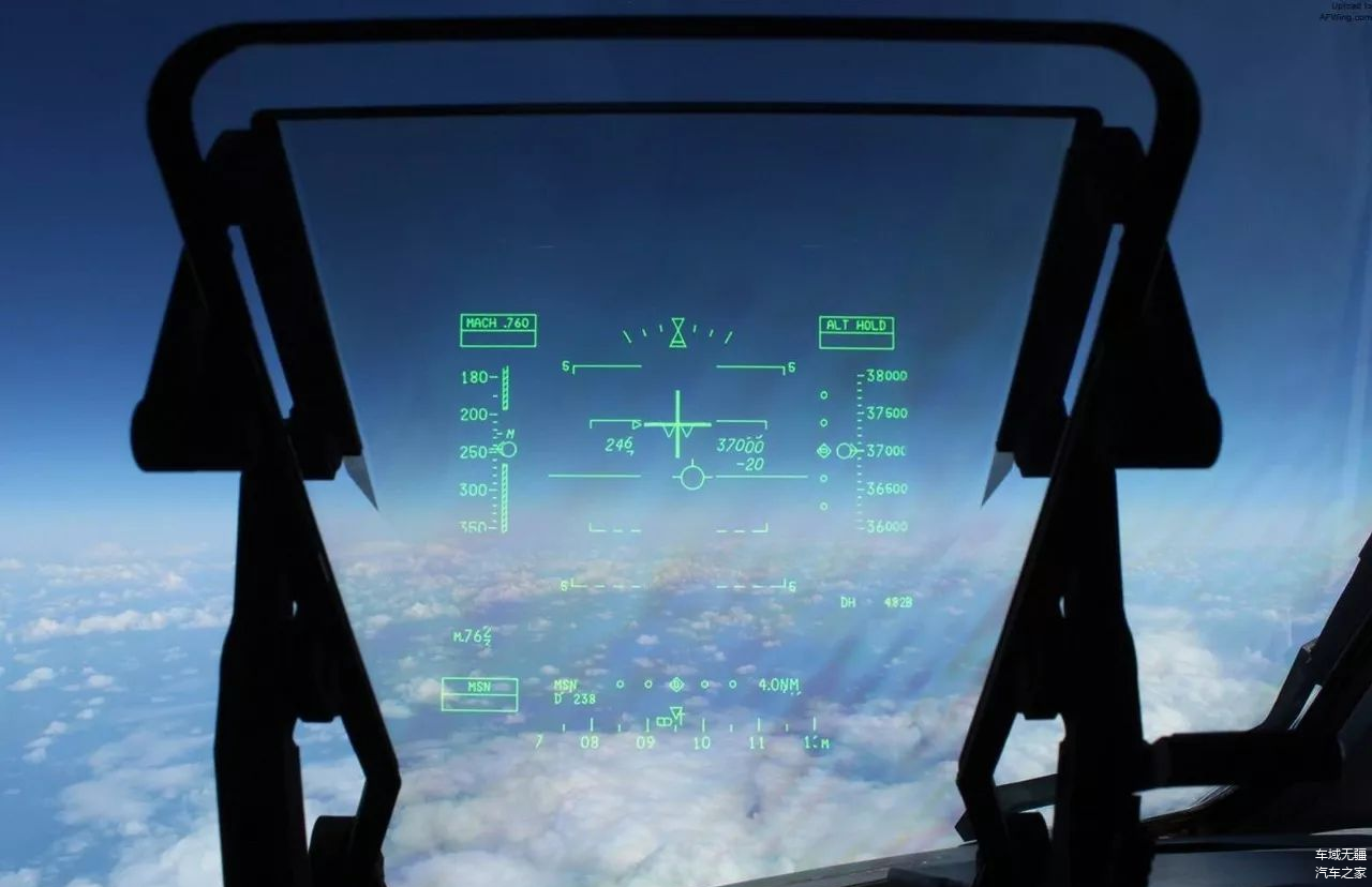 “抬头显示”的英文名称为Head Up Display,简称HUD。这项技术最早应用于军事飞机上,它能够通过光学反射原理将重要信息投射在座舱前端,使飞行员不必低头就能够查看重要数据,保障飞行安全。