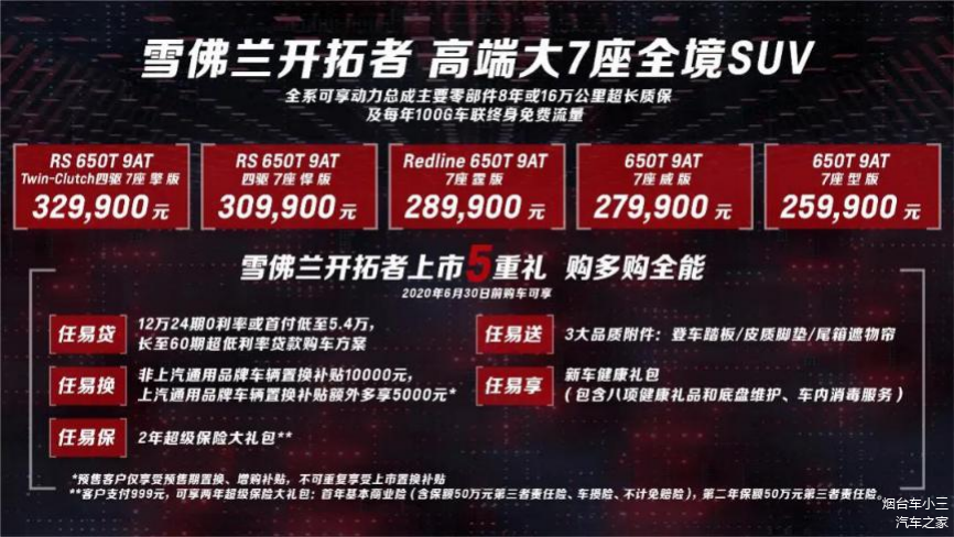 雪佛兰开拓者的上市,不仅强势助力雪佛兰品牌实力和形象的提升,更将进一步壮大雪佛兰产品阵营,为不同需求的中国消费者提供更多样化的购车选择。即日起至6月30日,购雪佛兰车型(畅巡除外)可享受两年超级保险礼包,此外,全系车型均可享动力总成主要零部件8年或16万公里超长质保。未来,雪佛兰品牌将继续凭借在服务、文化、科技、产品等方面的全球新实力,让消费者充分享受更愉悦、更高品质的有车生活。更多详情敬请咨询雪佛兰烟台当地经销商。
