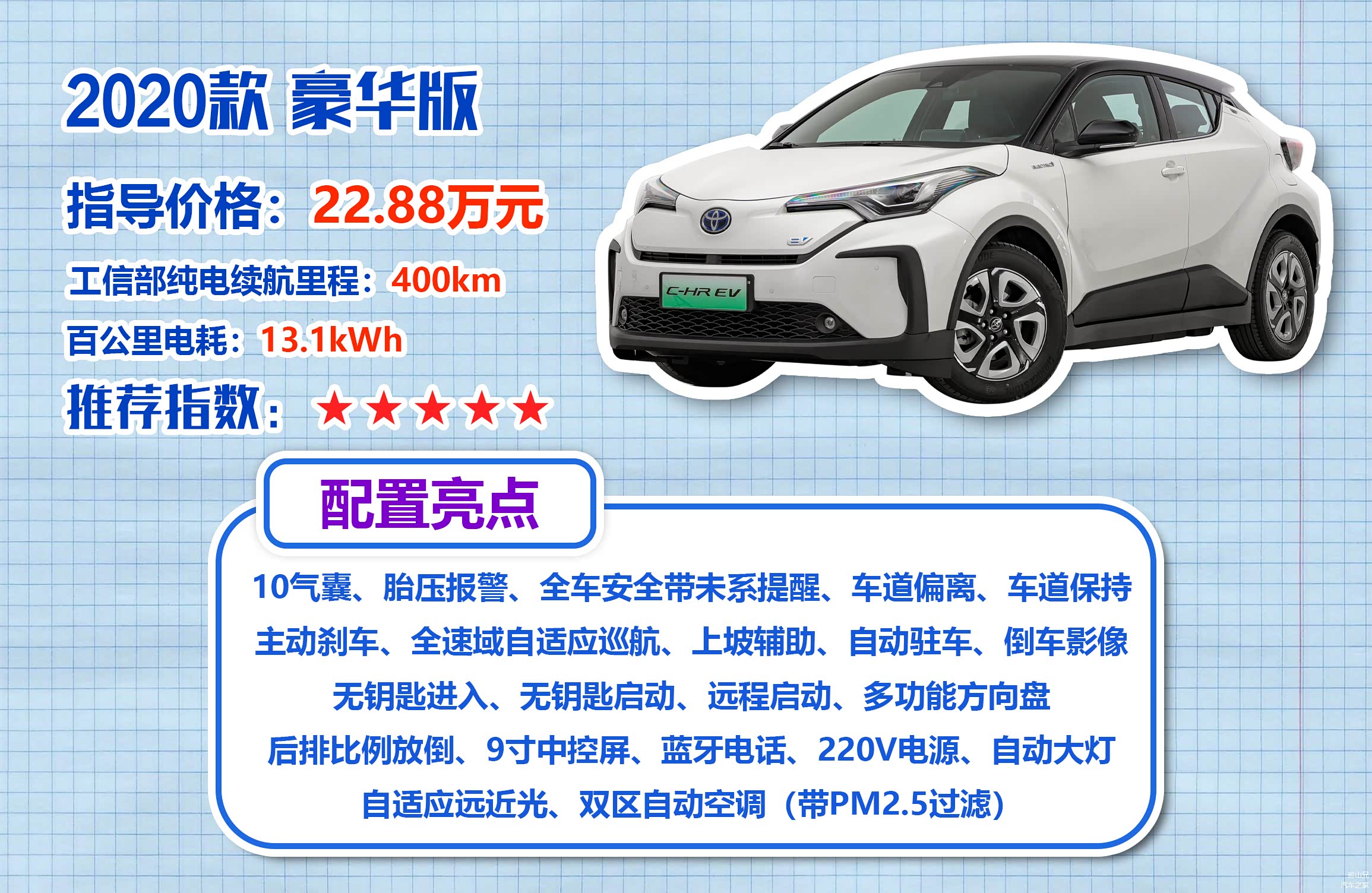巡山兄认为C-HR EV中性价比最高的是22.88万的豪华版,从舒适性配置角度讲全速域自适应巡航、上坡辅助、自动驻车、倒车影像、无钥匙进入、无钥匙启动、远程启动、多功能方向盘、后排比例放倒、9寸中控屏、蓝牙电话、220V电源、自动大灯、自适应远近光、双区自动空调(带PM2.5过滤)均有配备,真皮方向盘和全车雷达后期汽配城加装也非常方便。安全性配置方面,10气囊、胎压报警、全车安全带未系提醒、车道偏离、车道保持、主动刹车基本上也属于越级配置。总体来说性价比很高。