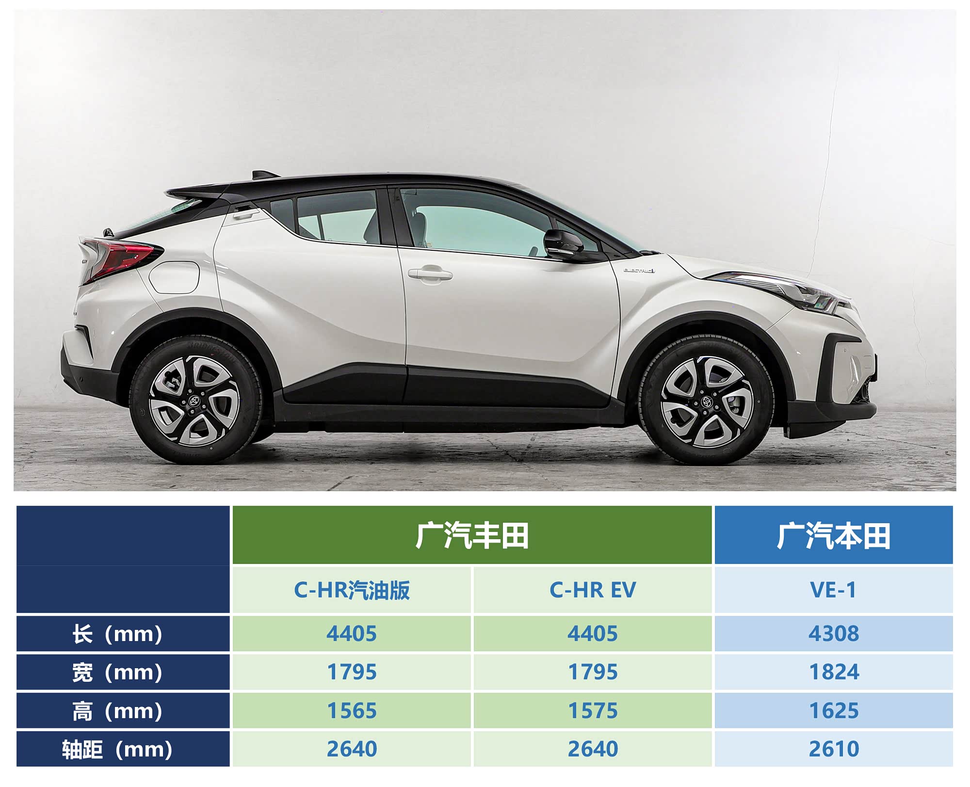 车身尺寸方面,C-HR EV和燃油版基本一致,仅在高度上多了10mm,整体和同级竞品广汽本田VE-1差不多,不过限于车尾动感的溜背造型,C-HR EV在后备厢空间上比广汽本田VE-1小不少,如果你比较在意比较在意装载空间,建议去4s店实际体验一下C-HR EV能否满足你的需求。