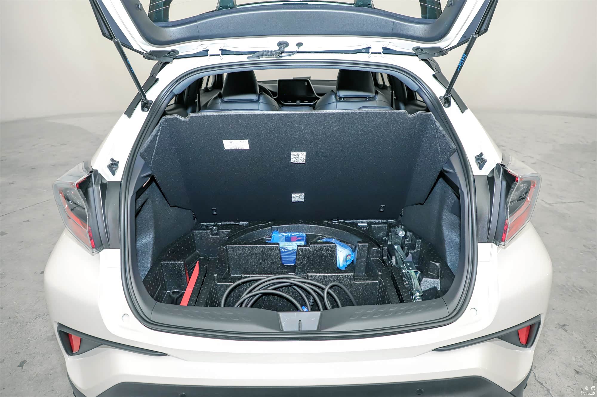 C-HR EV的后备厢与燃油版C-HR相比变化不大,区别就是带天窗版无备胎,无天窗版有非全尺寸备胎,后排座椅支持4/6比例放倒,放倒后地台能做到全平,空间不算特别大,但整体比较规整。