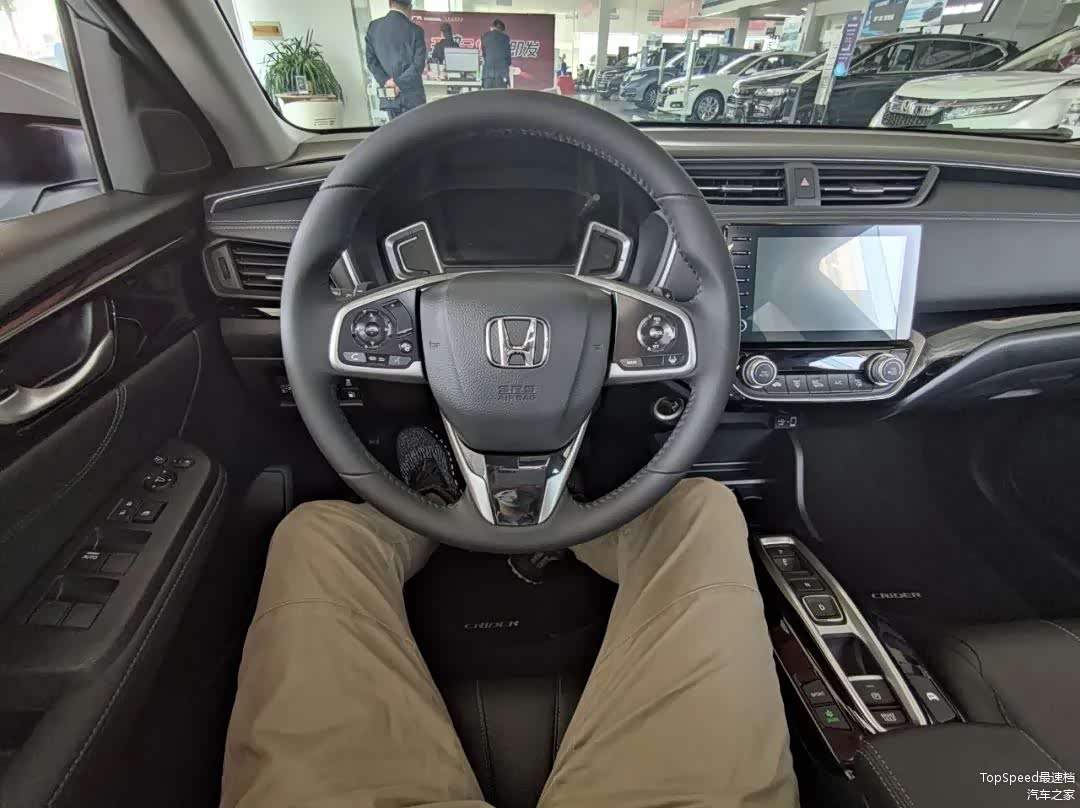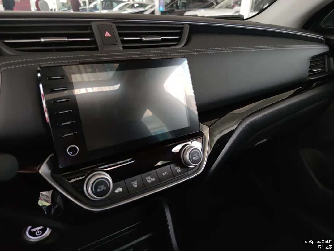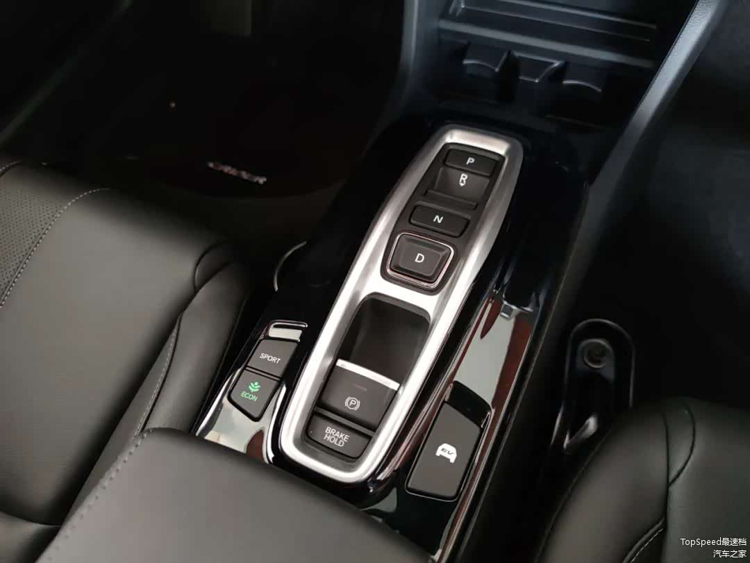 既然是本田的混动版车型,那内饰最明显的变化就是将传统换挡杆变成了按键式换挡机构了。电子手刹、自动驻车、纯电模式开关和驾驶模式选择按键都集中在了这里。7英寸彩色液晶屏显示界面与燃油版车型有区别,另外一个小细节是,一键启动的背景光变成了白色。