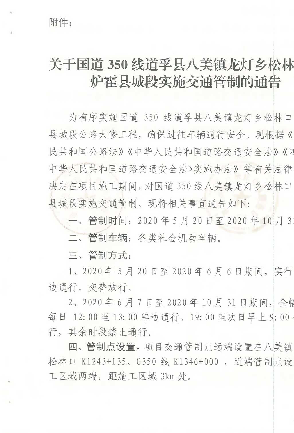 四、管制点设置:项目交通管制点远端设置在八美镇龙灯乡松林口K1243+135、 G350 线K1346+000,近端管制点设置在施工区城两端,距施工区城3km处。