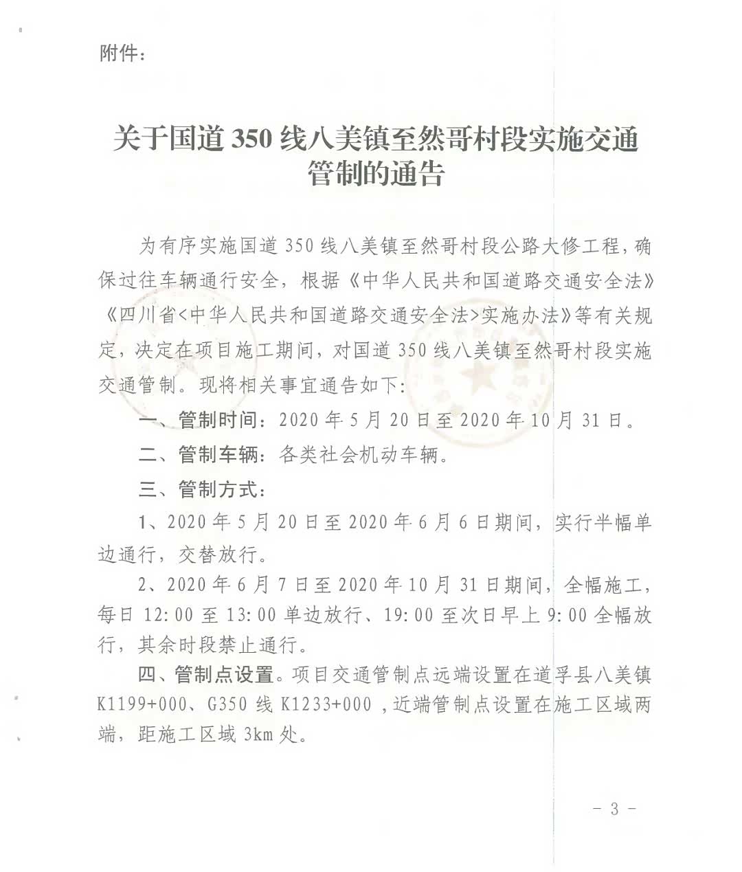 四、管制点设置:项目交通管制点远端设置在道孚县八美镇1199+000、G350 线K1233+000 , 近端管制点设置在施工区域两端,距施工区域3km处。