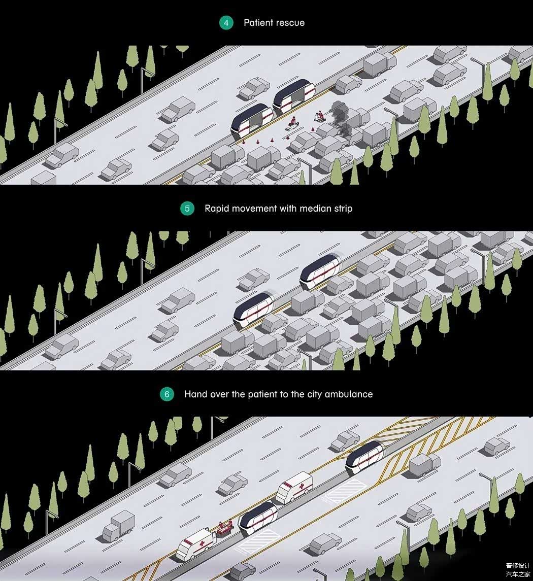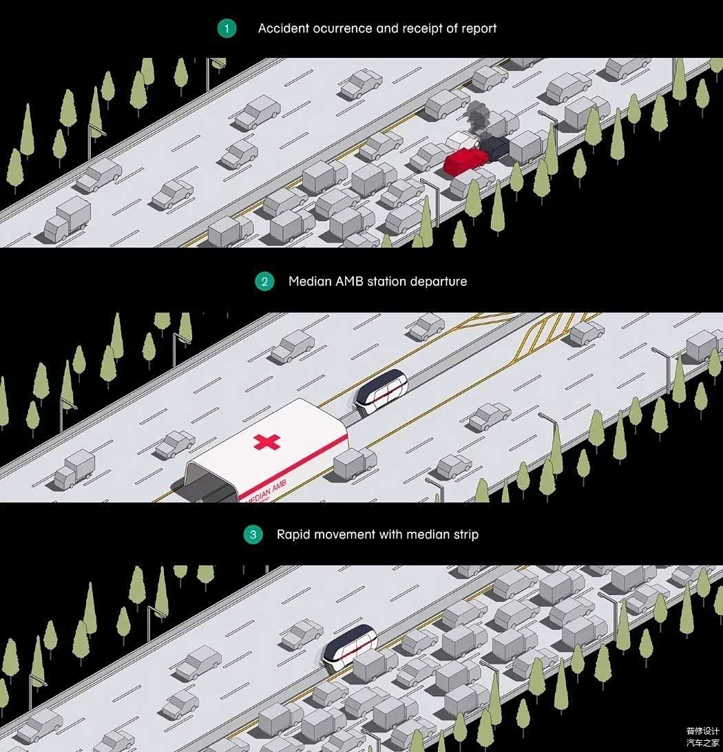 为此,一群韩国设计师创造了中型AMB,这是一种特殊的救护车,可以直接到达事故现场,而不受事故造成的交通拥堵的影响。中位AMB位于道路分隔线/中位,几乎像单轨铁路一样在高速公路上行驶。中间的AMB是红点设计概念奖的得主。