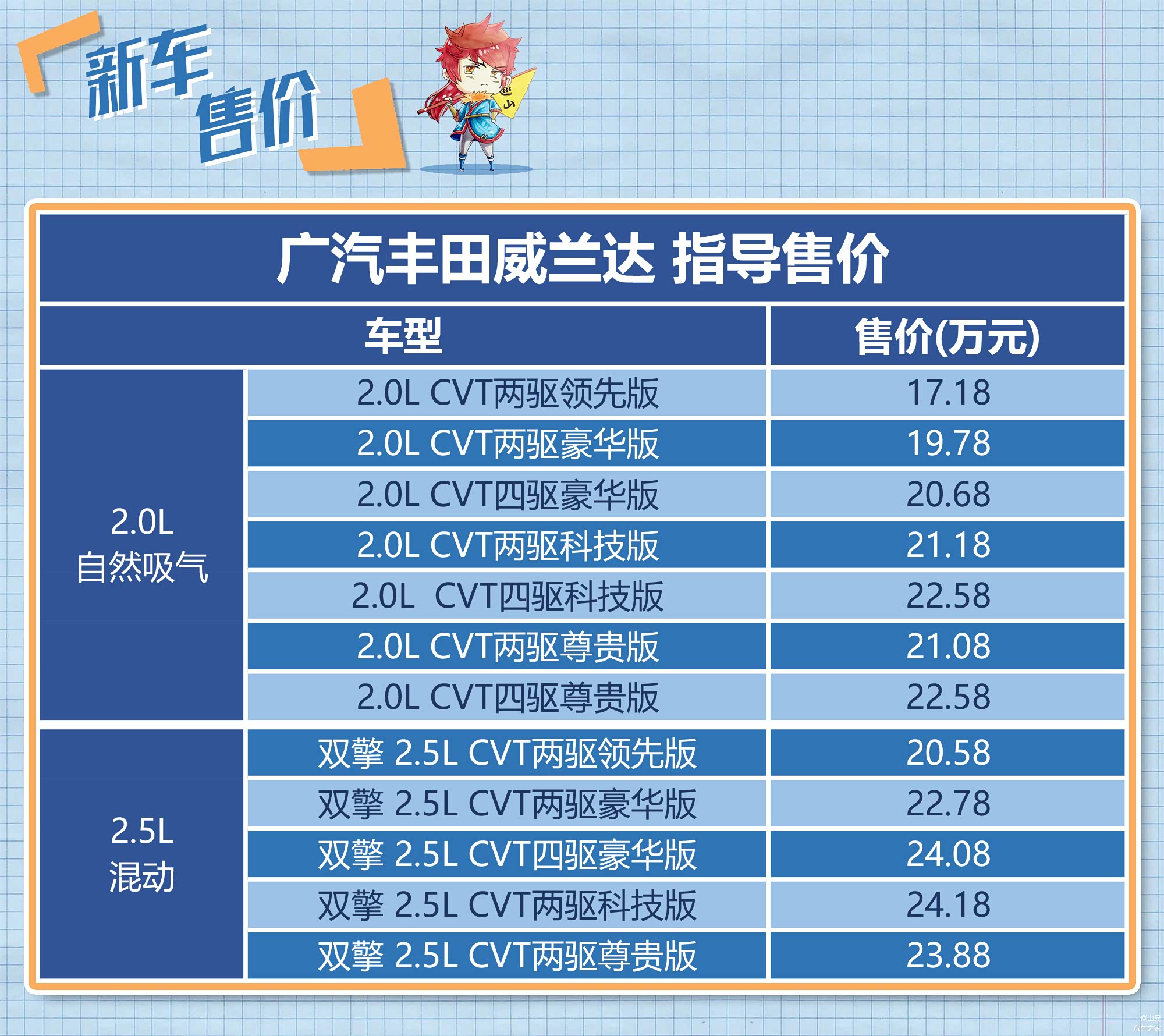 目前威兰达在售车型分为2.0L自吸和2.5L混动两种动力总成。通过查阅配置表,巡山兄感觉2.5L混动在配置上缺乏一款旗舰车型。两驱尊贵版有座椅通风,但没有全景天窗、HUD和四驱,有全景天窗和HUD的科技版车型也没有四驱,唯一的装备E-FOUR四驱的四驱豪华版没有全景天窗,这就让配置党选起来非常纠结。巡山兄希望之后广汽丰田能推出一款装备全景天窗、HUD、座椅加热/通风和四驱系统的顶配车型,价格可以去到26万元左右。