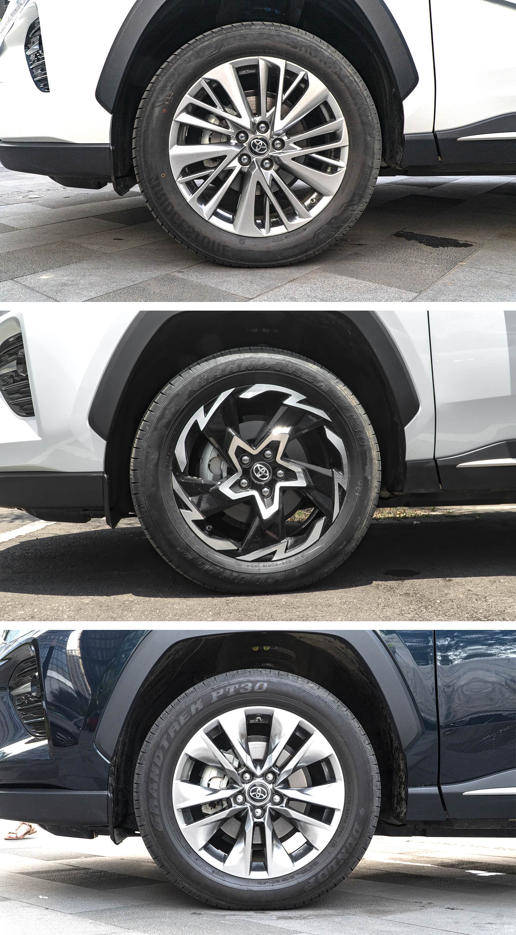 轮毂方面,本次试驾的2.5L双擎四驱豪华版采用的是18寸羚羊角造型轮圈,整体看起来简练大方,与之匹配的是邓禄普GRANDTREK PT30轮胎,尺寸为225/60 R18。科技版和尊贵版车型则会使用18英寸拼色和19寸W型高光轮毂。就现场实车效果来看,三款轮毂各有特色,巡山兄最喜欢19寸W型高光轮毂,在尺寸、造型,工艺上都很有档次感,有点儿雷克萨斯的感觉。