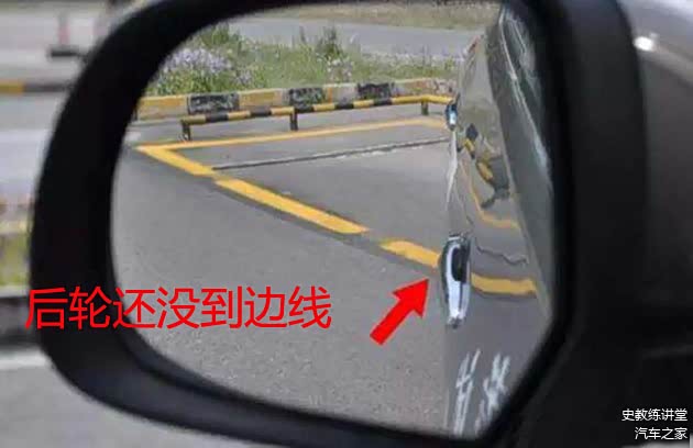 学员通过后视镜看后轮和边线关系时,会有误差。多数学员看镜子,都是身体坐直,微微扭头。这样,你看到的后轮搭边线,实际上是个假象。实际上,只是后轮挡住了边线,并没有走到搭线的位置。