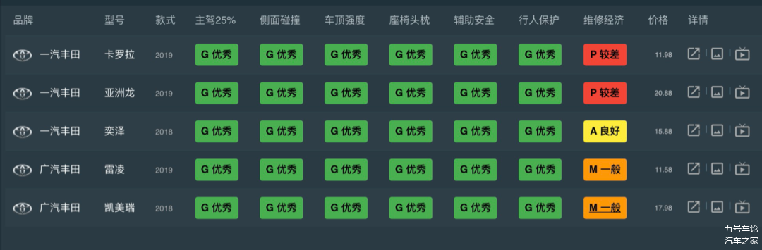 或许丰田早期被25%偏置撞击摔痛了,在往后开发的TNGA架构上,提前做了应对。至少从这个时间点来看,丰田车型在中保研里是全优表现。甚至可以说,中保研的测试是在给丰田做广告。