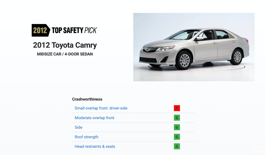 回想中保研原型——美国IIHS,最初出25%偏置撞击时,丰田表现并不好,例如当年七代凯美瑞就撞出差评。后来丰田针对测试进行优化,但又出现尴尬一幕。