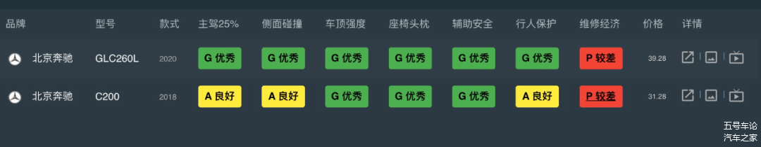 奔驰目前测了GLC L和C级,GLC L在安全保护方面,各项成绩全优秀。但C级表现就较平淡,有三项只拿到良好。所以奔驰在中保研只能说过得去,并不符合本文旗下车型全优的要求。
