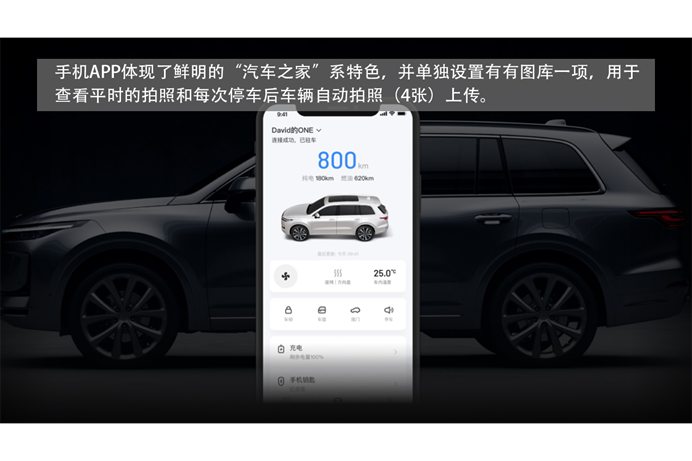 手机APP体现了鲜明的“汽车之家”系特色,并单独设置有有图库一项,用于查看平时的拍照和每次停车后车辆自动拍照(4张)上传。此外,手机端还支持空调、座椅、方向盘、车辆门窗开关的远程控制。还能够完成寻车、查看充电状态、预约充电、手机蓝牙钥匙、查看车辆位置、授权无钥匙驾驶等功能。