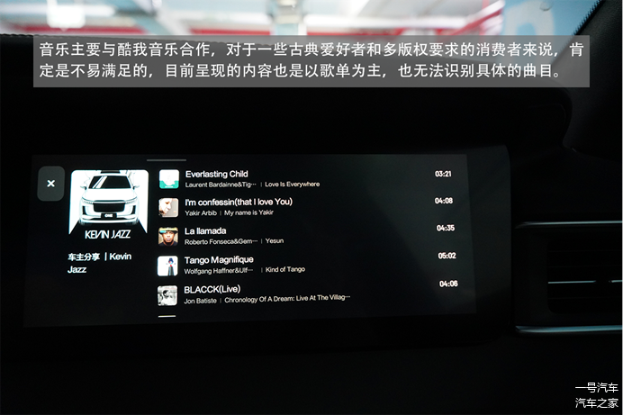 音乐主要与酷我音乐合作,对于笔者这样的古典音乐爱好者来说,肯定是不易满足的,但是这也是所有车载音乐的共性问题。目前呈现的内容也是以歌单为主,也无法识别具体的曲目。主屏机制与其他产品比较接近,同样为推荐、分类和榜单显示。