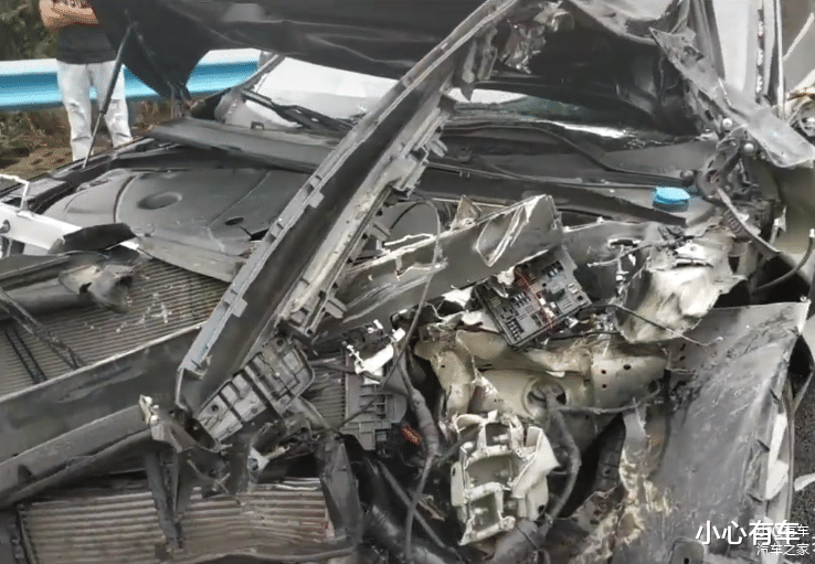 我们通过现场图片可以看到,前面的公路养护车已经被撞得严重变形,整个尾箱、备胎、后轮和悬架等均被撞毁,可见当时的撞击力量有多大!我们再来观察下沃尔沃S90的损失情况,可以看到这辆S90的车头部分也发生了不小变形,前面的一些覆盖件几乎全部报废,里面的防撞梁、纵梁、翼子板、散热器和水箱等配件也都受到了影响,损失十分严重!
