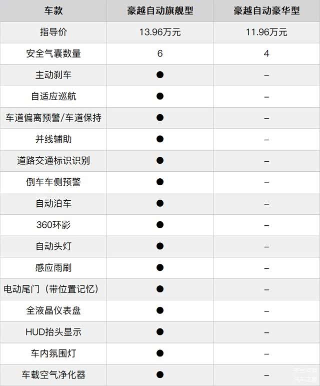 而豪华型和旗舰型之间2万元差价主要体现在L2级的主动安全和驾驶辅助系统,以及车内的科技感营造上(全液晶仪表盘、HUD、更大的中控屏幕),而消费者只要略作盘算,就会发现多花的钱在安全性和舒适性配置上都有相应的体现,如果再算上7座选装包,一旦锁定购买,很难抵挡得住豪越旗舰型车款在配置上的诱惑力。