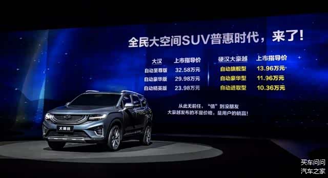 毕竟这款车从去年工信部新车申报中初次亮相,到陆续放出的各种丰富配置,以及在前期预热和产品营销上无差别捆绑汉兰达这样的王者级中型SUV,都给外界以吉利要打造一款全新高定位产品的既视感,而且直到最终公布售价的阶段,豪越也不忘强调自己的价格「不到汉兰达的一半」。