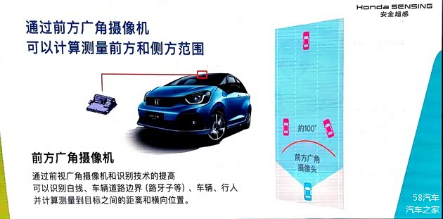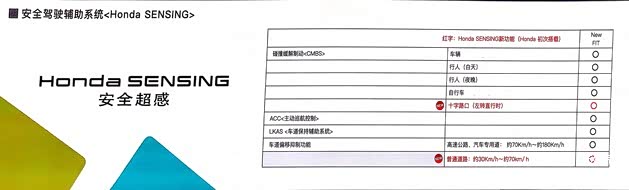 我们本次试驾的两款顶配车型都配备了本田Honda SENSING(安全驾驶辅助系统),其与其它品牌车型采用摄像头与毫米波雷达来识别全方路况不同,其只使用了一个前方广角摄像机就可以计算测量前方和侧方范围,可以识别白线、车辆道路边界、车辆、行人并计算测量到目标之间的距离和横向位置。
