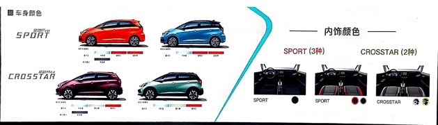 第四代飞度在外观颜色上将提供单色和双色车身,其中SPORT版本单色车身有六种颜色,双色车身有四种颜色;CROSSTAR版本单色车身有六种颜色,双色车身有四种颜色。内饰SPORT版本提供三种颜色,而CROSSTAR版本则有两种颜色,选择可谓相当丰富。