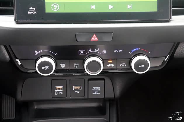 在大屏的下方,则是空调控制区域。第四代飞度将全系标配手动空调,三颗大旋钮的设计让操作非常方便。新车将会设置两个USB接口和一个12V电源插口,给电子设备充电还是很方便的。