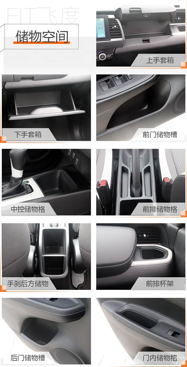 车内的收纳空间依然是新飞度的优势,前排两侧出风口有两个杯架,炎热的夏天把饮料放在这里吹一吹就能喝出“冰镇”的效果;上下两层的手套箱也相当实用,不仅增加了储物空间,而且还可将不同的物品分类放好;中控台下方一直到手刹的位置有很多不同规格的储物格,可以用来放钱包、钥匙和手机等随身物品;四个门板内侧拉手也有一个储物格,平时放一些小物品也很方便,此外门板内侧的储物槽设置的比较大,前排能轻松放下折叠雨伞等长条形物体,后排放两瓶小的饮料也问题不大。