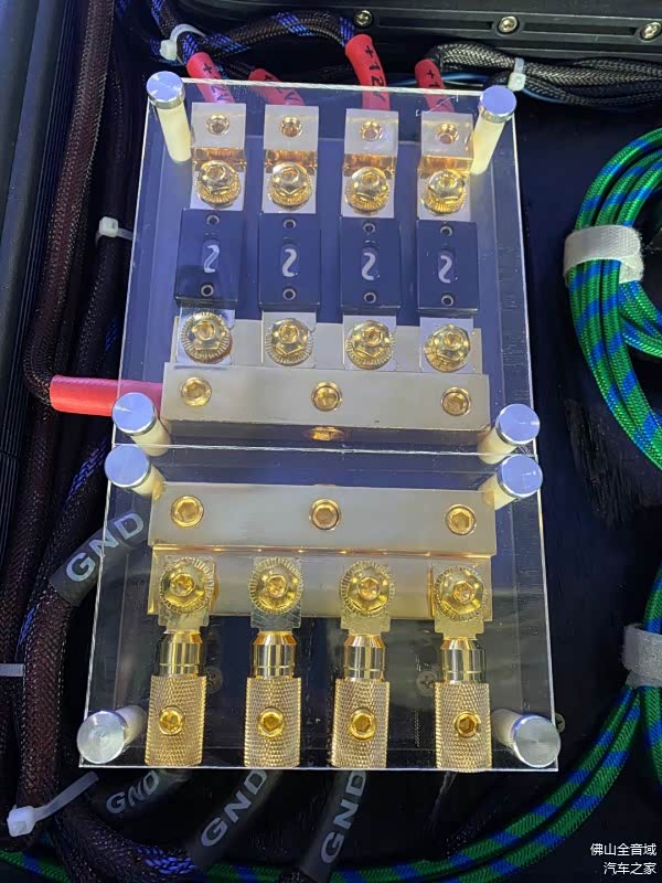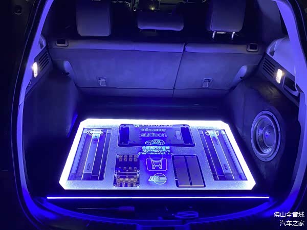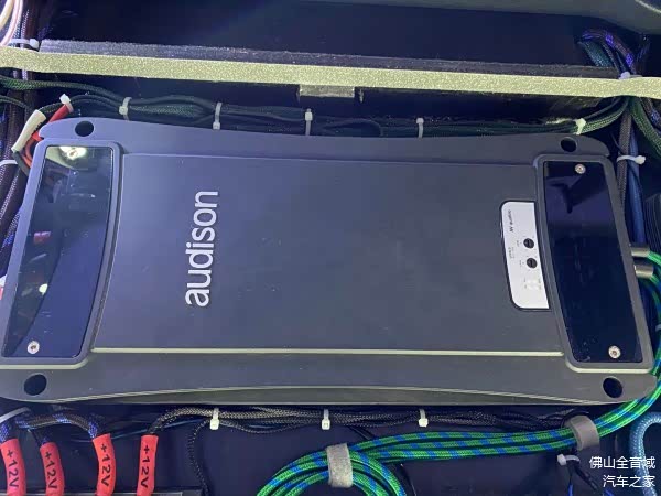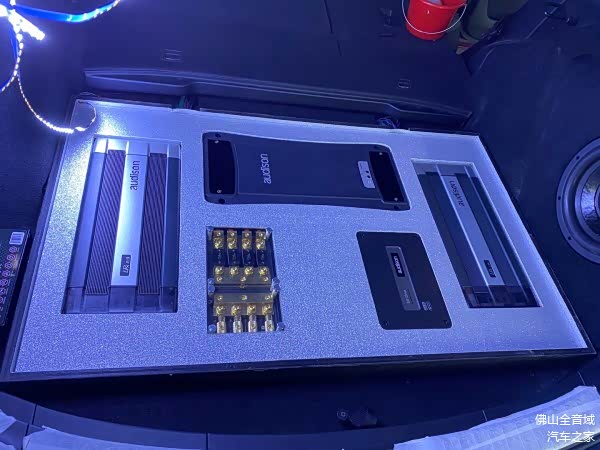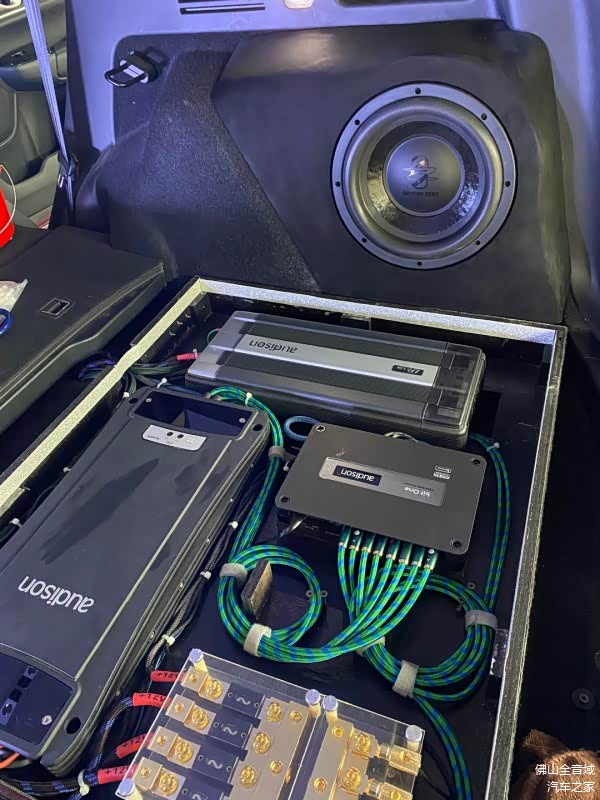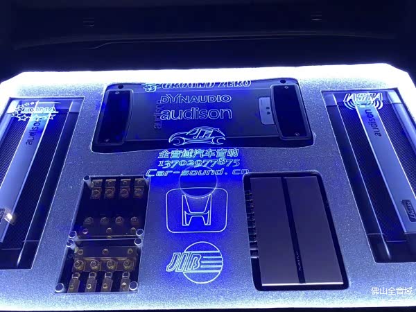 全车日本笛神音隔,不但开车的时候安静舒适,还给音响升级提供一个良好的播放环境。日本索尼SONY RSX-GS9+5.0蓝牙光纤数码转盘音源,与意大利欧迪臣bitOne处理器,能让系统获得纯正、清晰度极高的声音。意大利欧迪臣LRX2.9 四路功放,推前声场丹麦丹拿三分频(高音Esotar2110+中音Esotar2430+中低音Esotar2650组合),歌声优雅、乐器细节丰富,不要说人声的演绎问题,就算是大气的交响乐演绎都不在话下。意大利欧迪臣AV quattro两路功放与意大利欧迪臣LRX1.1K单路功放,分别推两个德国零点铀系列GZUW10SQX超低音,解像力好、低频下潜深极其震撼。发烧级的改装,线材的投入是不可以忽略的,德国蟒蛇JIB发烧级音频线、发烧级喇叭线、纯无氧铜电源、竞赛级保险座,已经是步入竞赛级别的改装了。改装了这么多器材必定担心原车电源功率供应问题,因此加了美国费洛特AMG高性能电池与两个零点电容,保证了系统的电压稳定,这个问题就不必再为此忧心了。