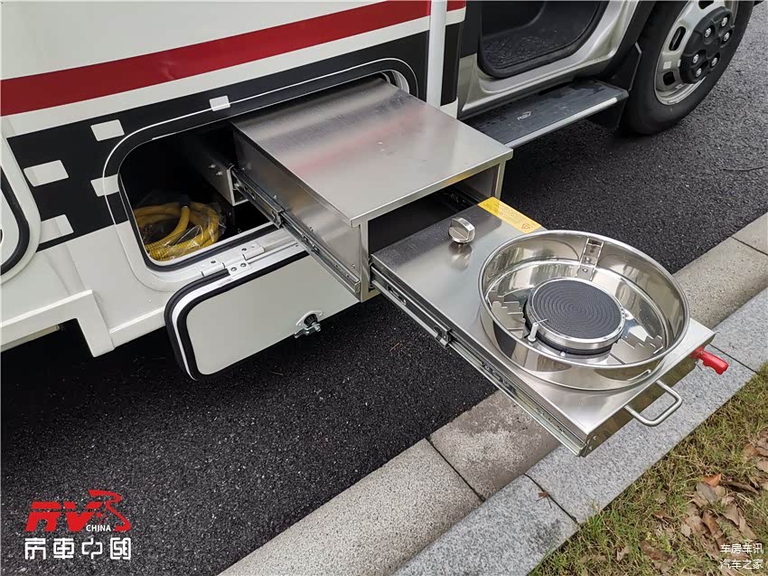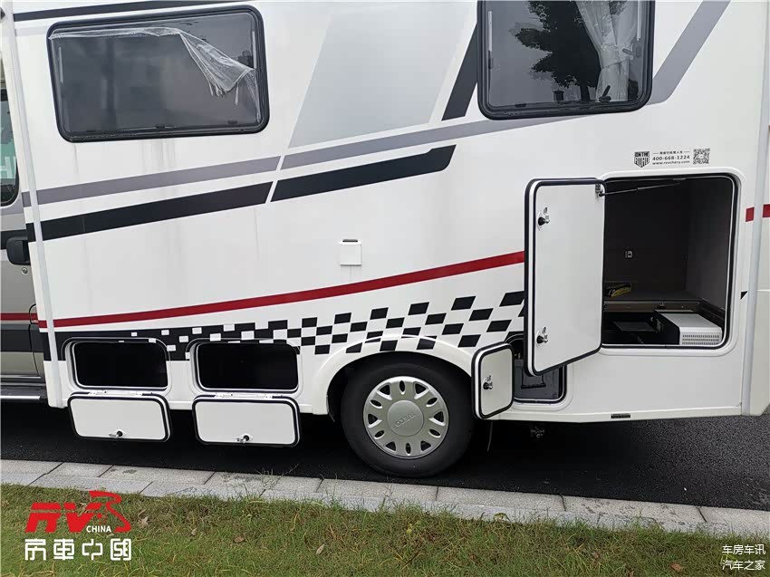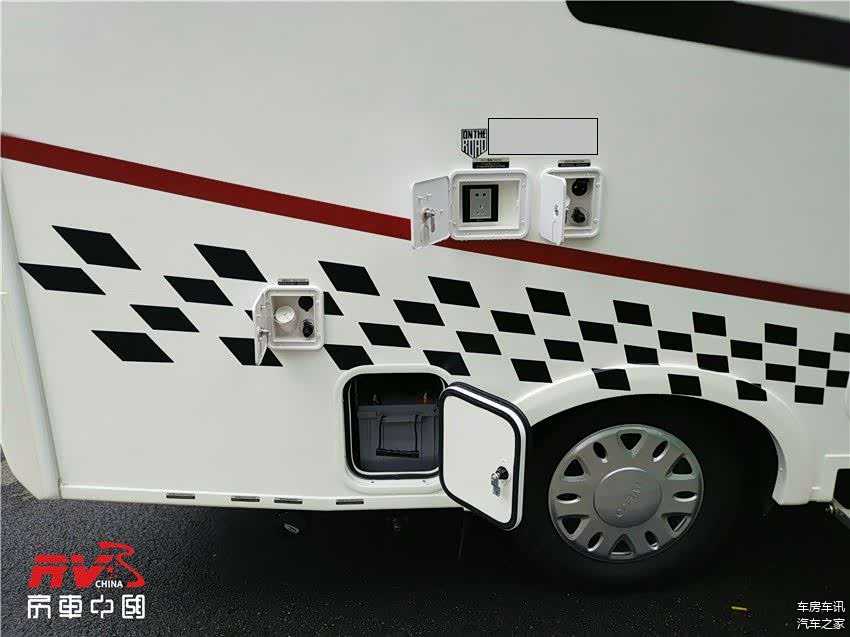 车体外观配件方面,配备了进口风感自动回收电动遮阳棚、电动踏板、户外照明灯、户外220V插座、外充电接口、加水口和抽水口、户外灶具以及储物舱门等。