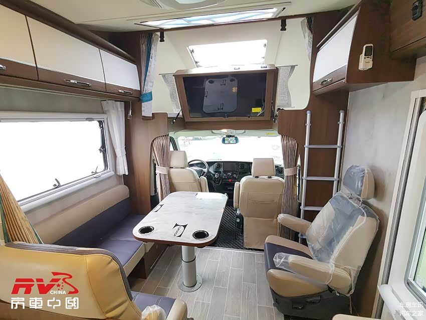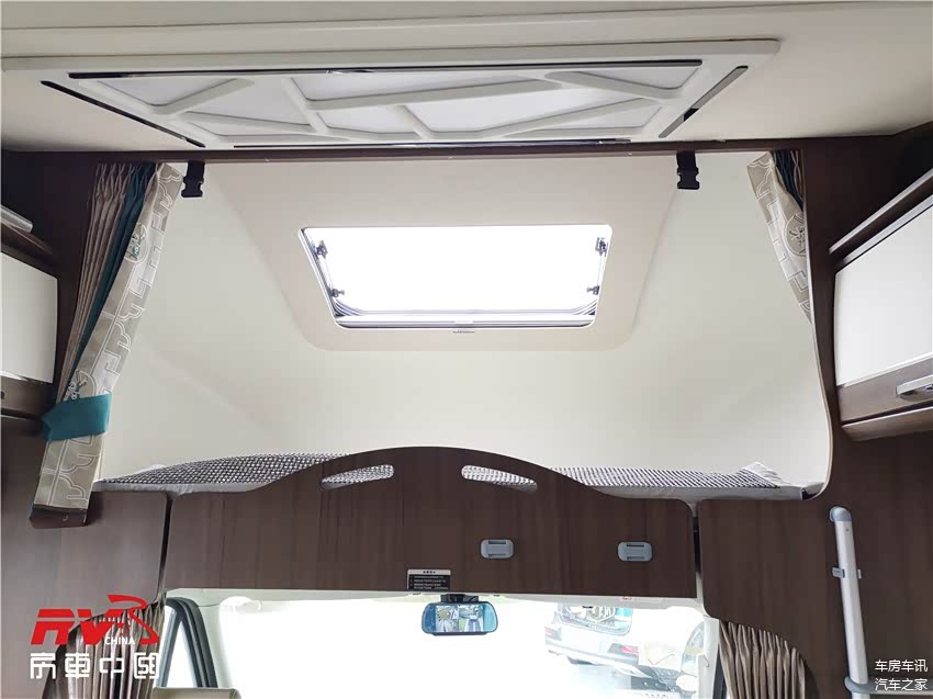 内饰布局采用的是客厅L型沙发座椅+后纵置双人床+额头床,是一般常见的布局,内饰家具则采用深色系列;驾驶上方是常见的额头床部位设计,配置了大尺寸弧形外推窗、两侧小尺寸房车窗、防护栏等,提供舒适的卧室环境;床板向上翻折后是32寸的高清液晶网络电视屏。